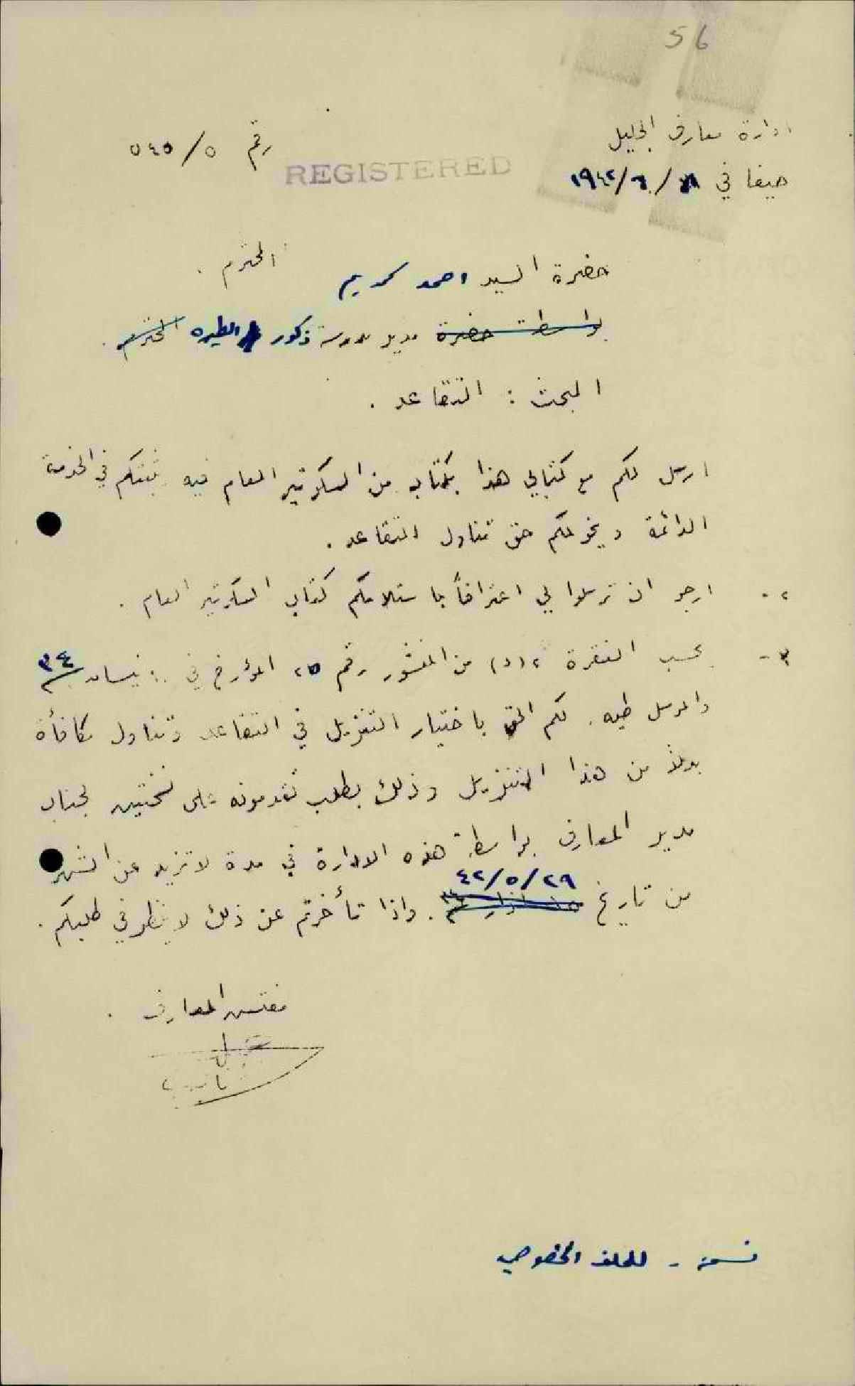 رسالة من مفتش المعارف الى المعلم أحمد كريّم بخصوص حقه في تناول التقاعد