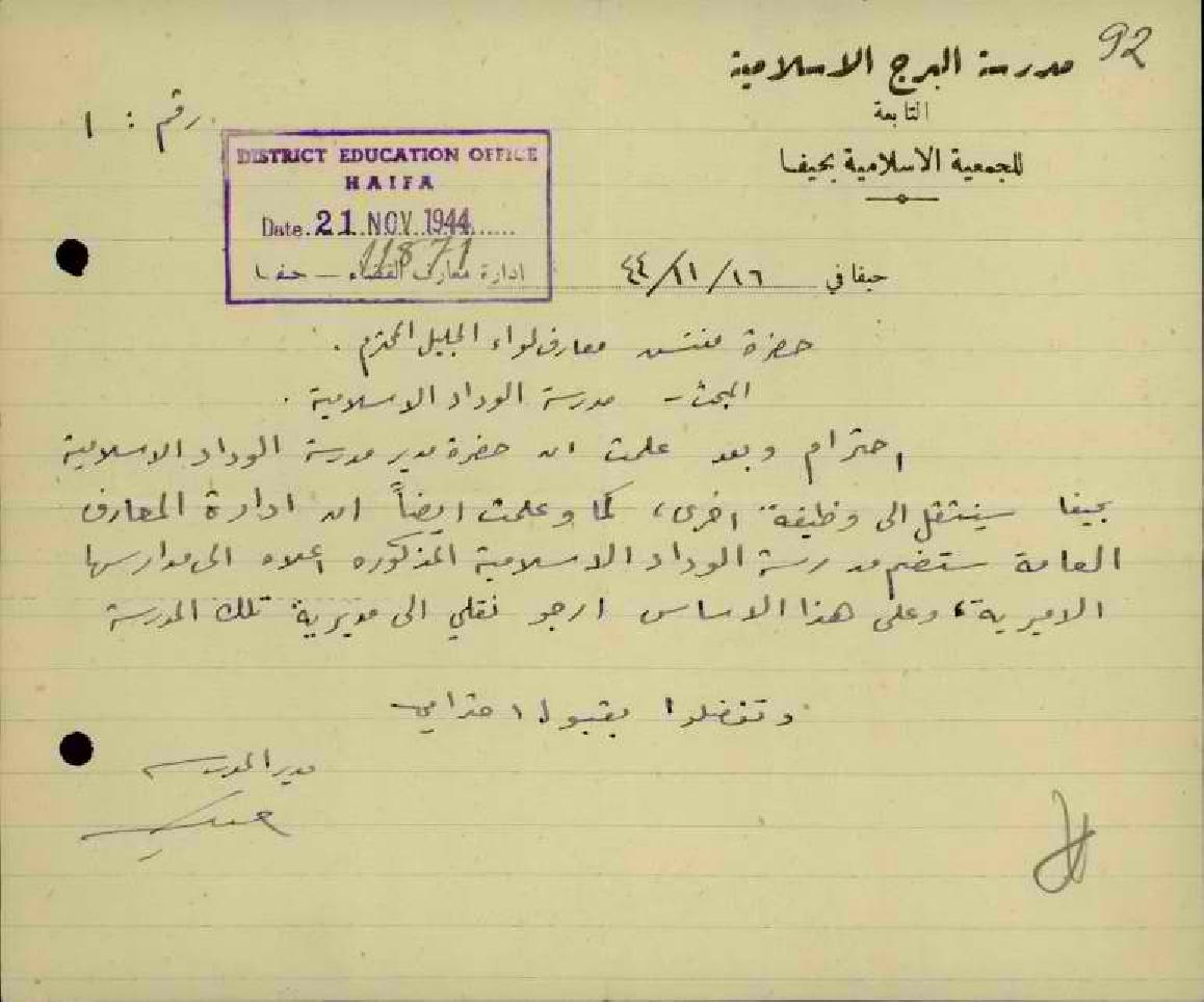 رسالة من المعلم أحمد كريّم الى مفتش المعارف يطلب فيها نقله من مدرسة البرج الاسلامية الى مدرسة الوداد الاسلامية