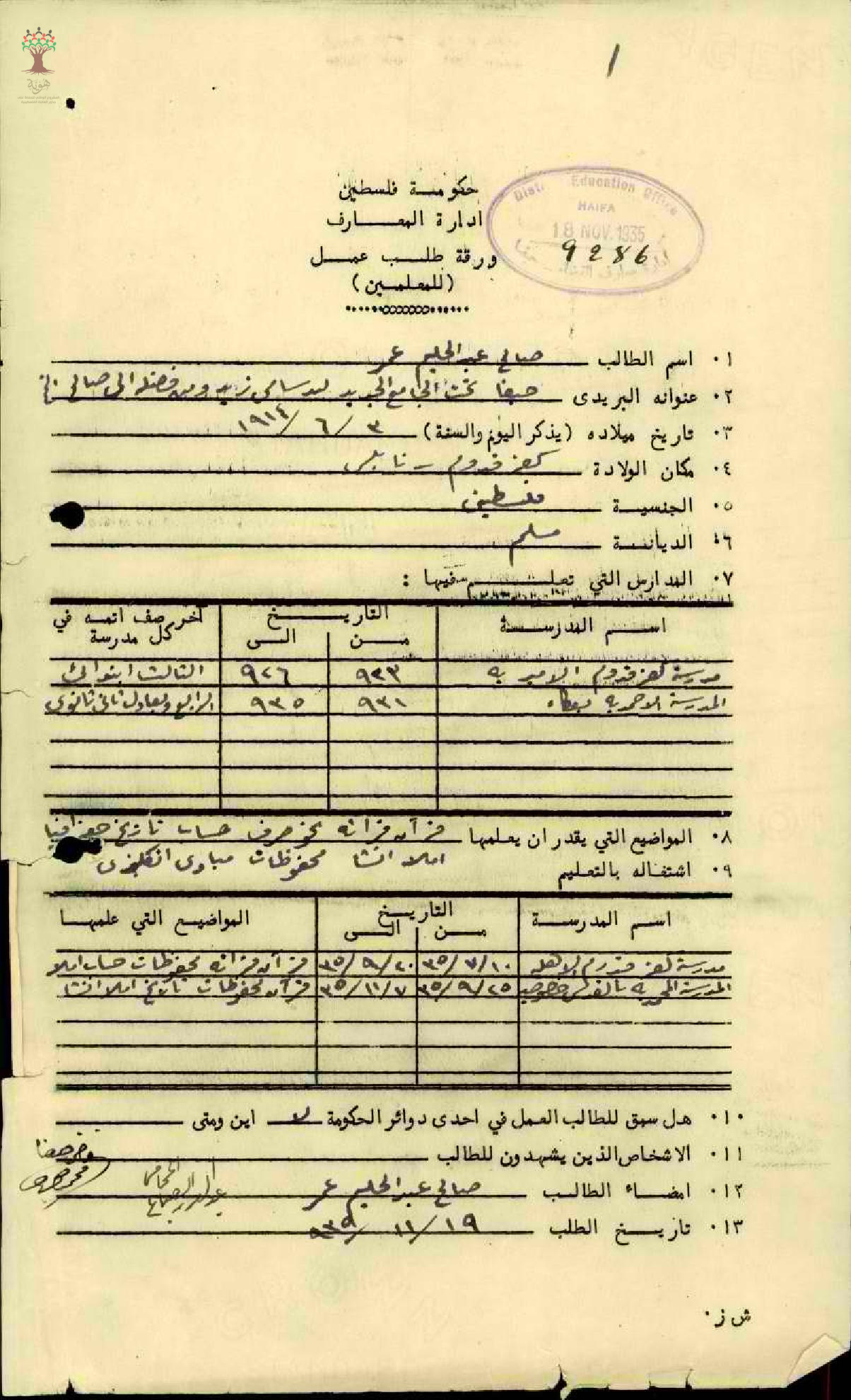 طلب عمل مقدم من المعلم صالح عبد الحليم القدومي - كفر قدوم