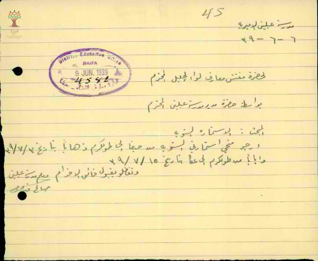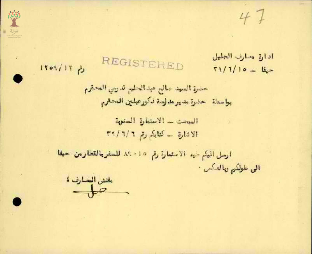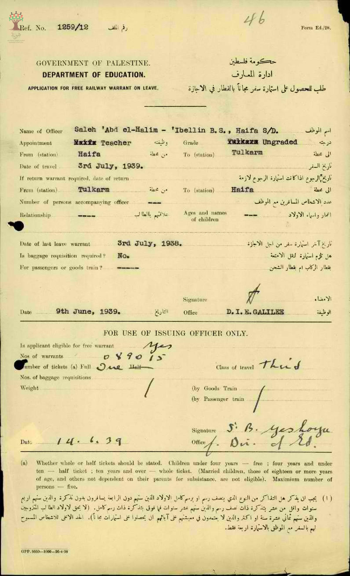استمارة سفر من حيفا الى طولكرم مقدم من المعلم صالح القدومي - كفرقدوم - مدرسة عبلين