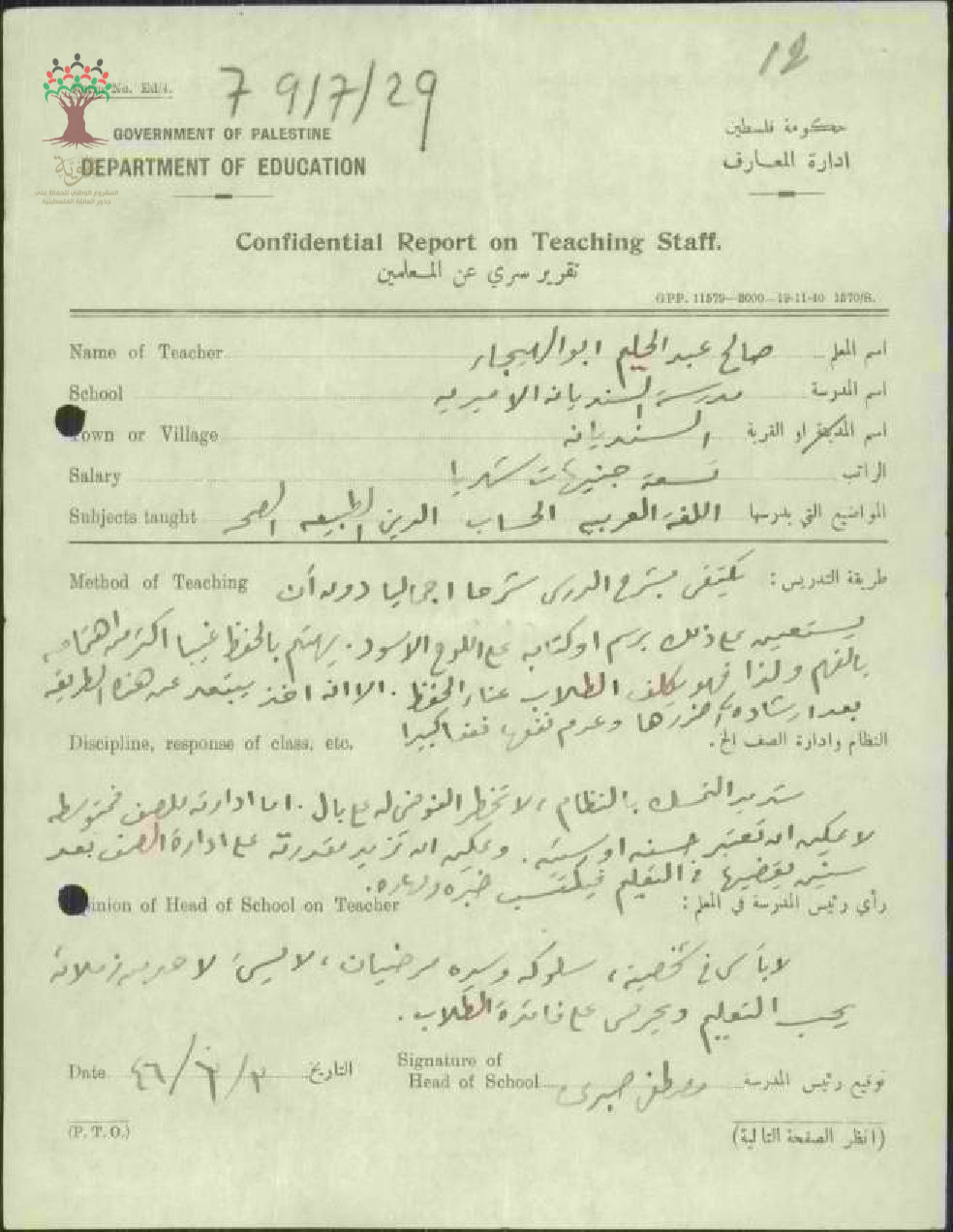 تقرير تفصيلي عن أداء المعلم صالح ابو الهيجا في مدرسة السنديانة سنة 1946