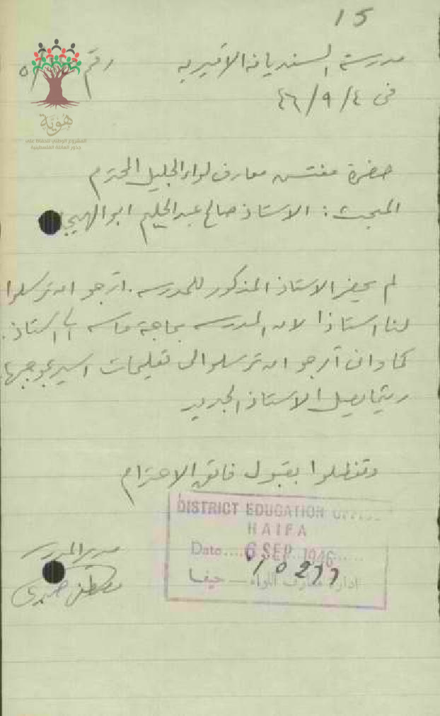 رسالة من مدير مدرسة السنديانة الى مفتش المعارف يخبره بأن المعلم صالح ابو الهيجا لم يحضر الى العمل