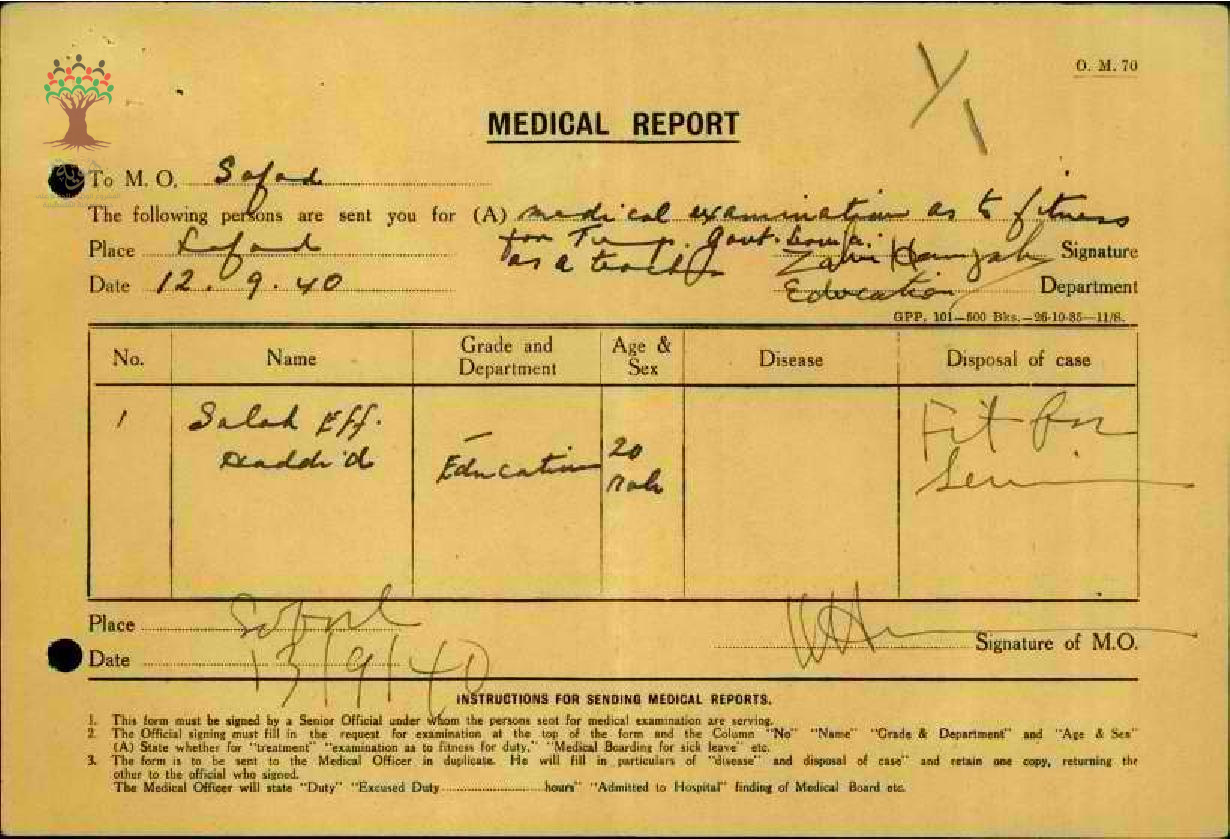 تقرير طبي لتعيين المعلم صلاح حجازي حديد في مدرسة المجيدل