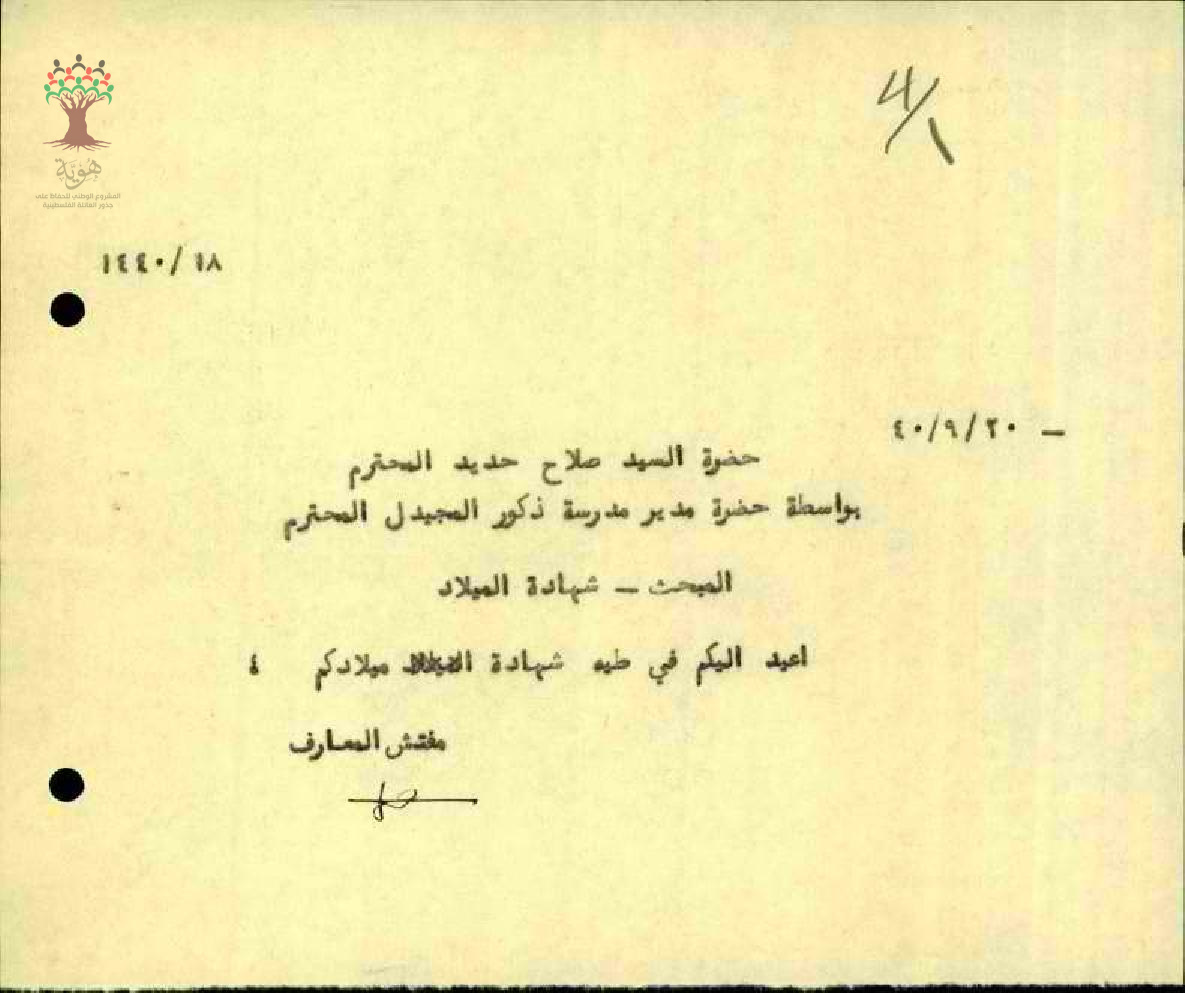 رسالة من مفتش المعارف الى المعلم صلاح حديد مرفقة بشهادة ميلاده