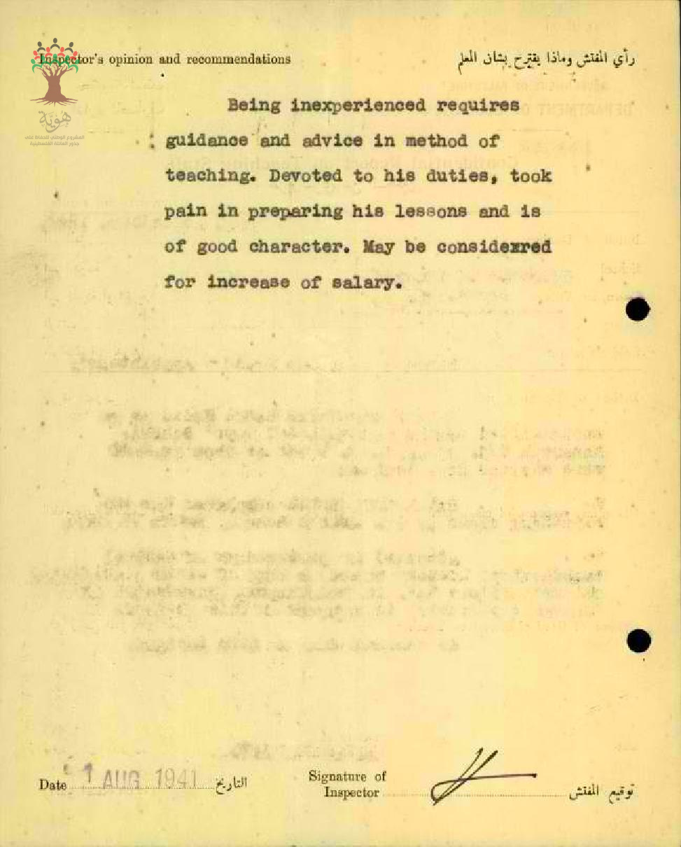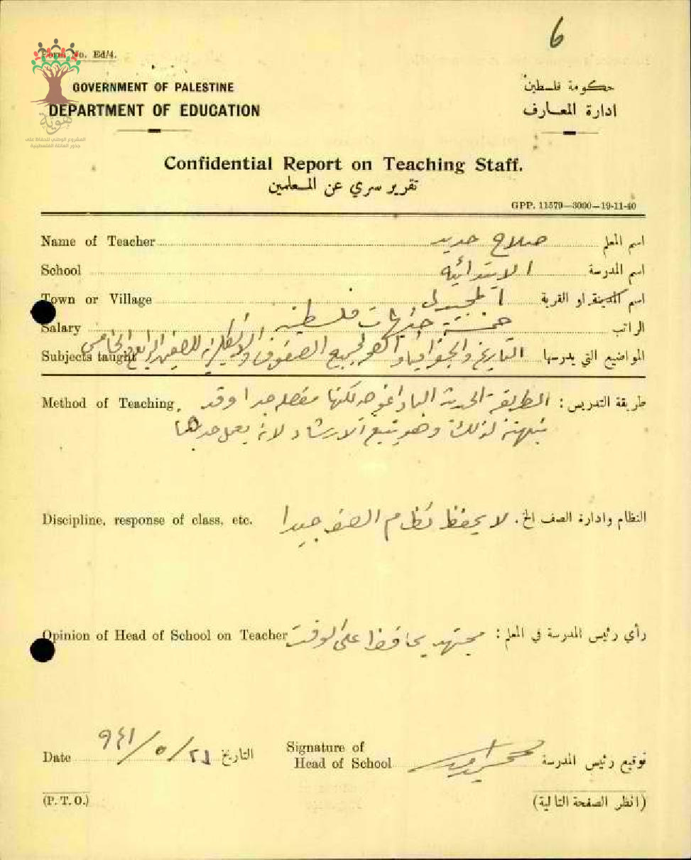 تقرير تفصيلي عن أداء المعلم صلاح حديد في مدرسة المجيدل سنة 1941
