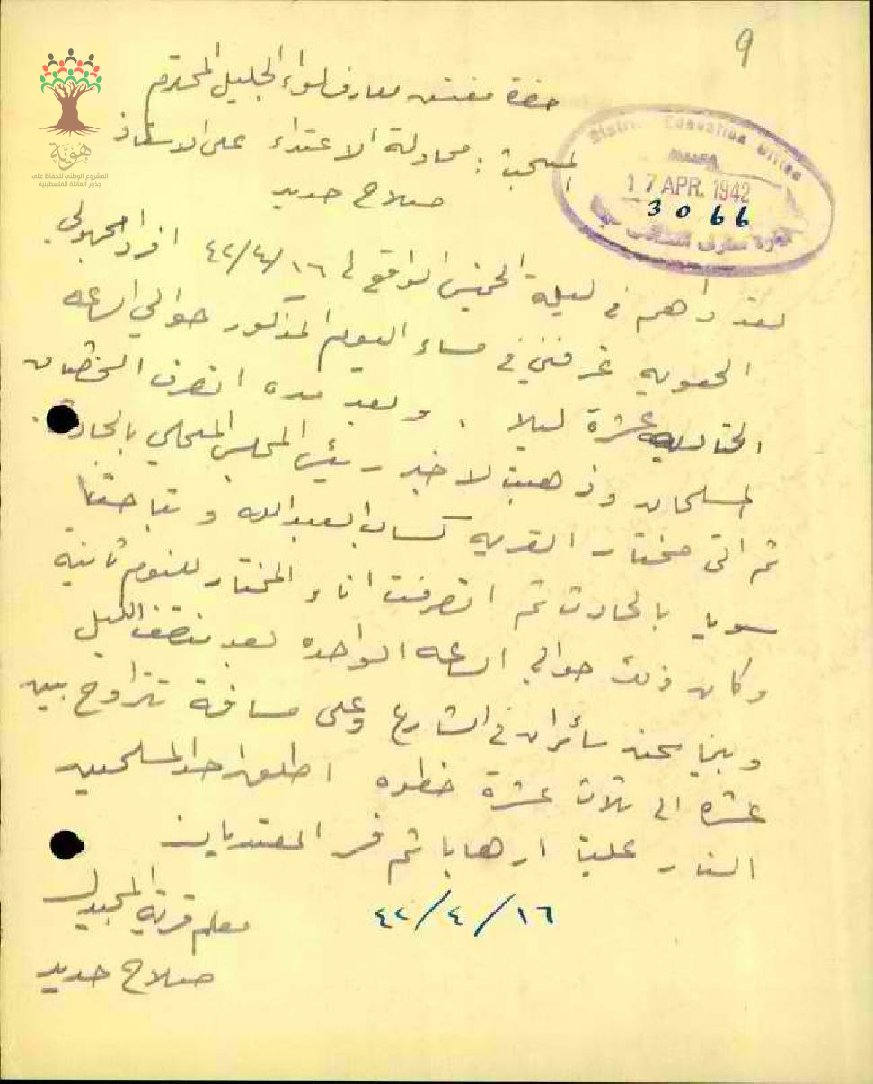 رسالة من المعلم صلاح حديد الى مفتش المعارف بخصوص حادثة الاعتداء عليه