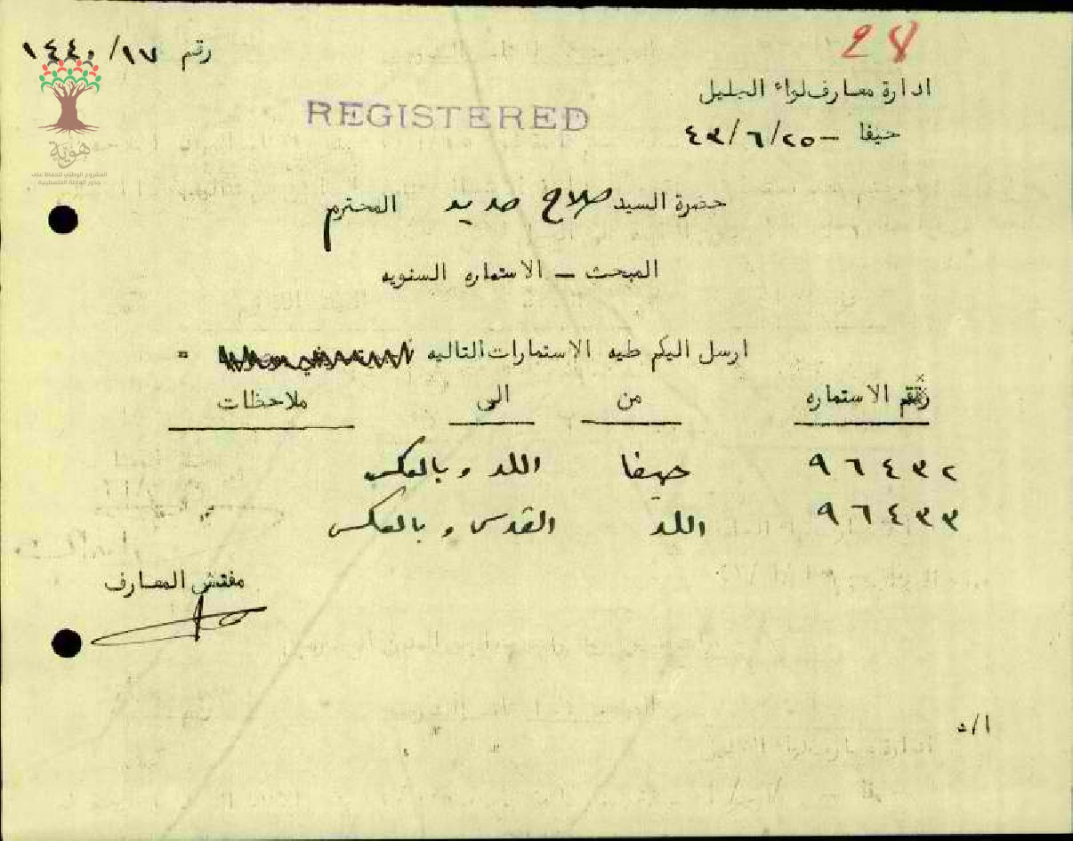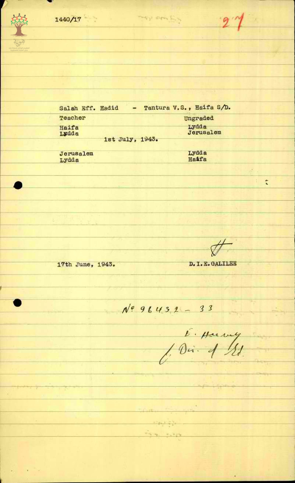 رسالة من مفتش المعارف الى المعلم صلاح حديد مرفقة باستمارة سفره