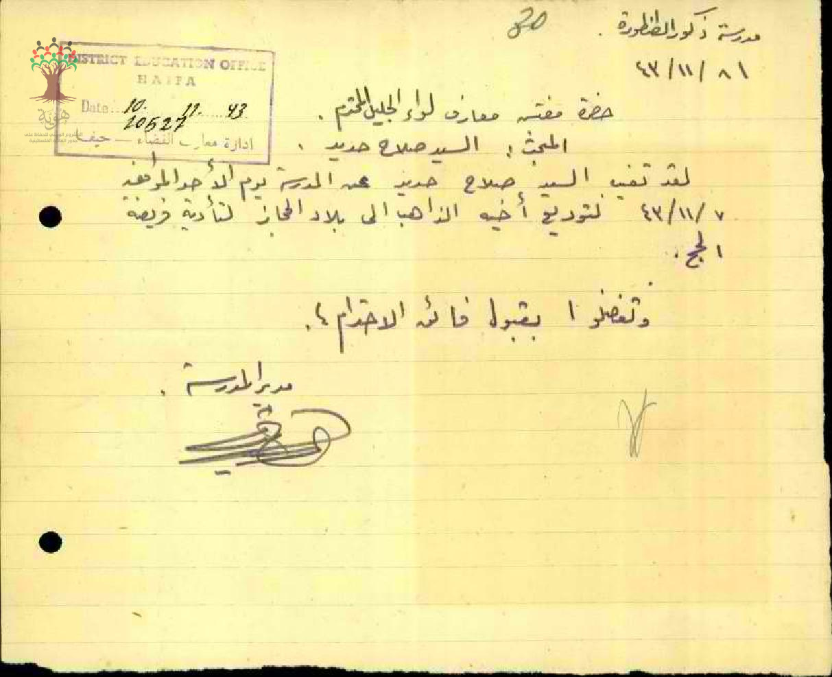 رسالة من مدير مدرسة الطنطورة الى مفتش المعارف بخصوص تغيب المعلم صلاح حديد لاستقبال اخيه القادم من الحجاز