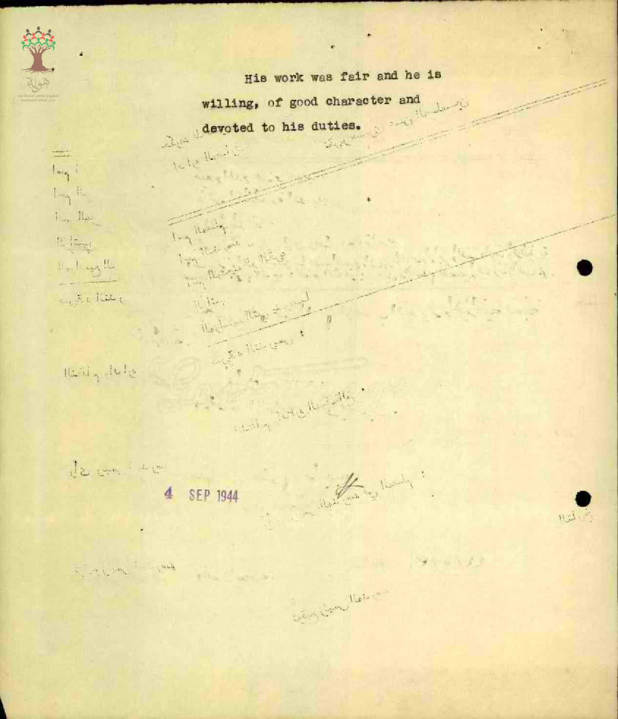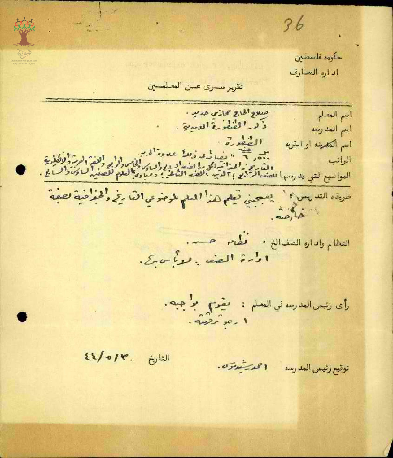 تقرير تفصيلي عن أداء المعلم صلاح حديد في مدرسة الطنطورة سنة 1944