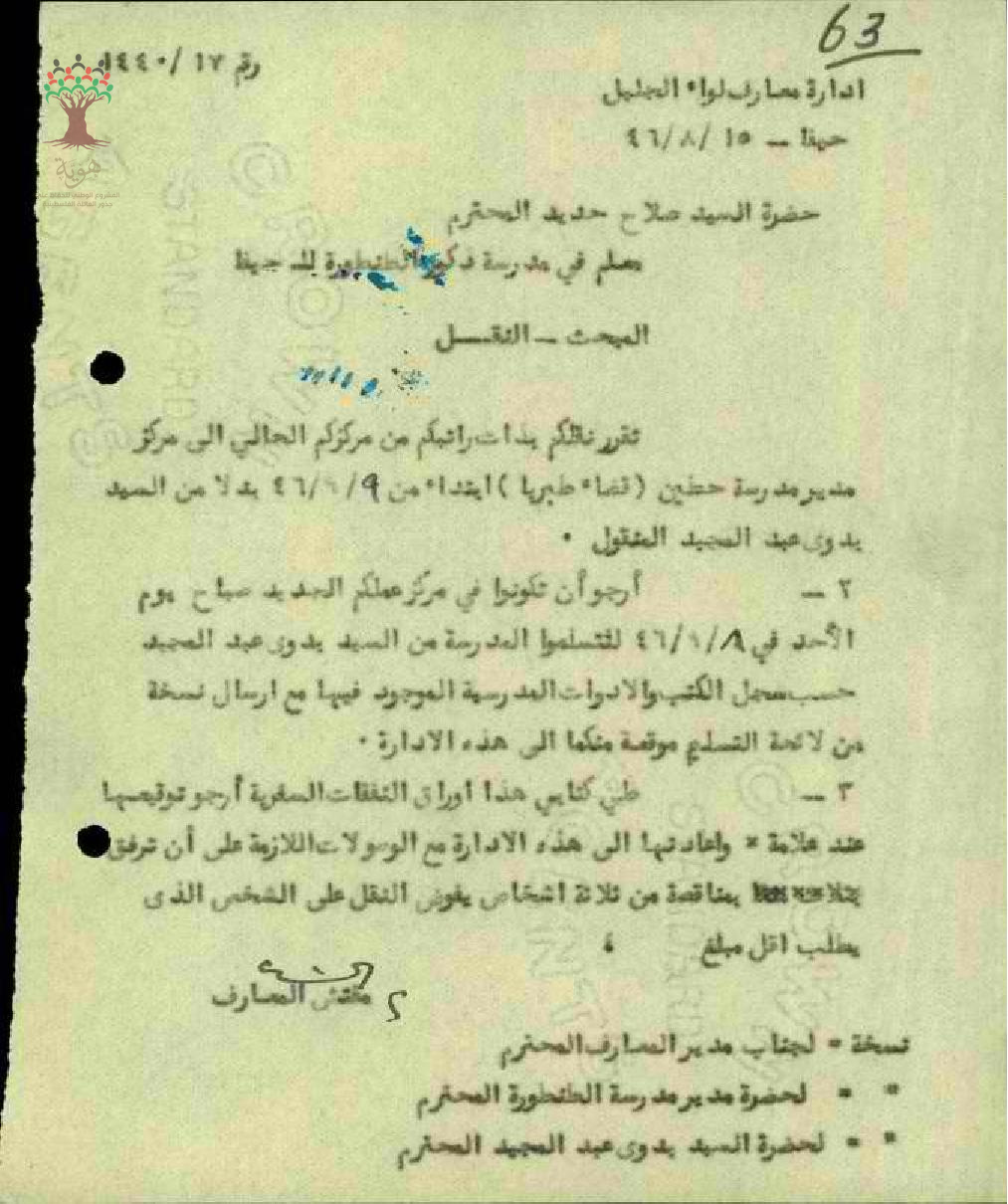نقل المعلم صلاح حجازي حديد من مدرسة ذكور الطنطورة الى مدرسة حطين