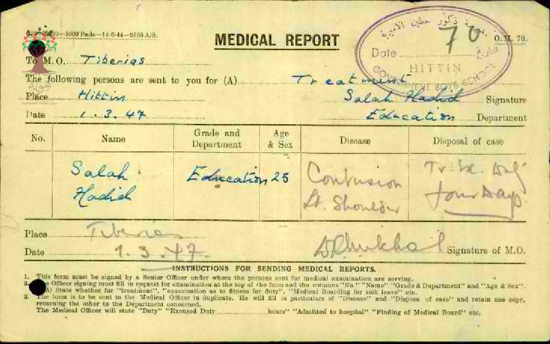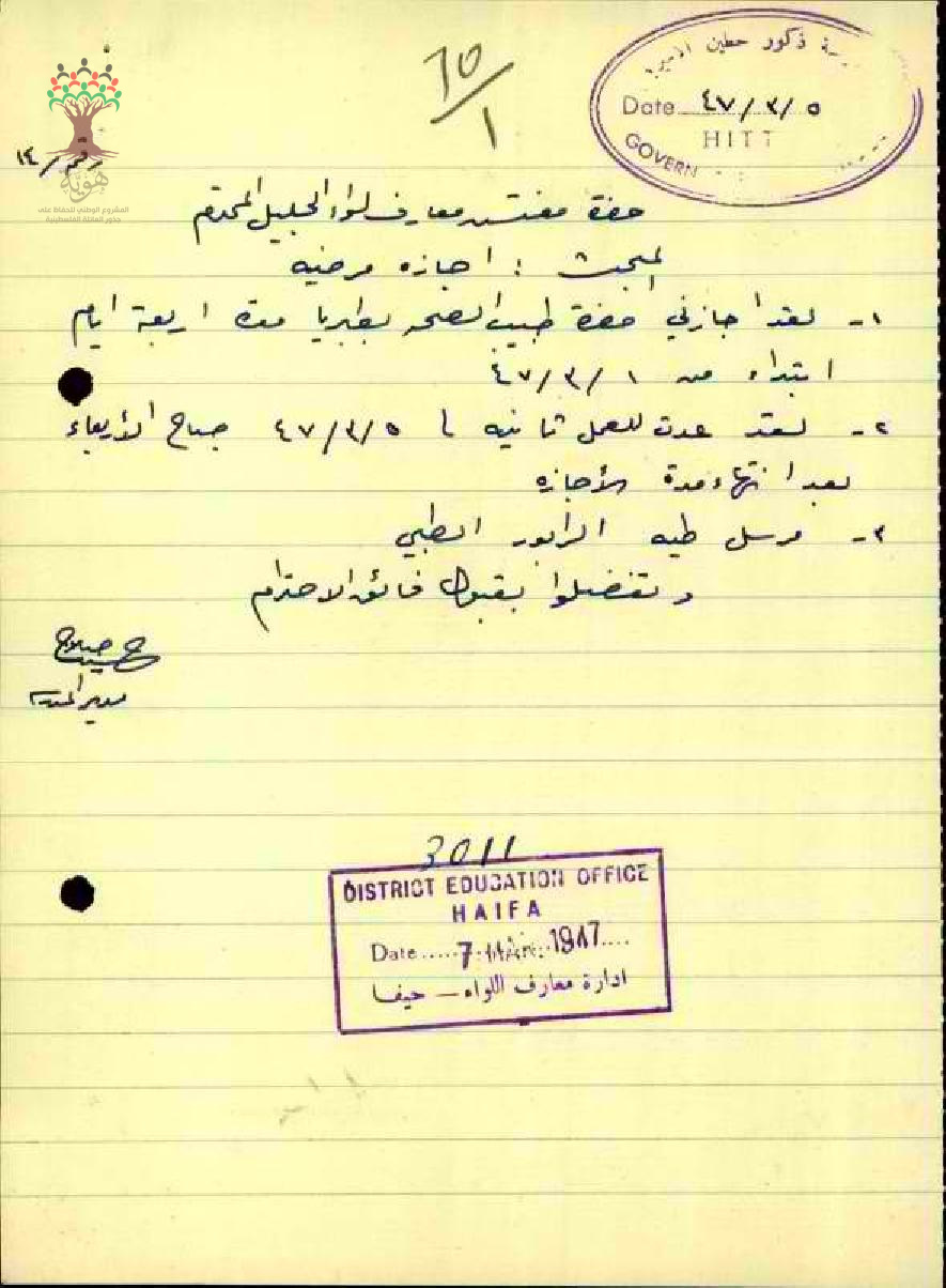 رسالة من المعلم صلاح حديد الى مفتش المعارف بخصوص تغيبه عن العمل مرفقة بالتقرير الطبي وعودته الى العمل