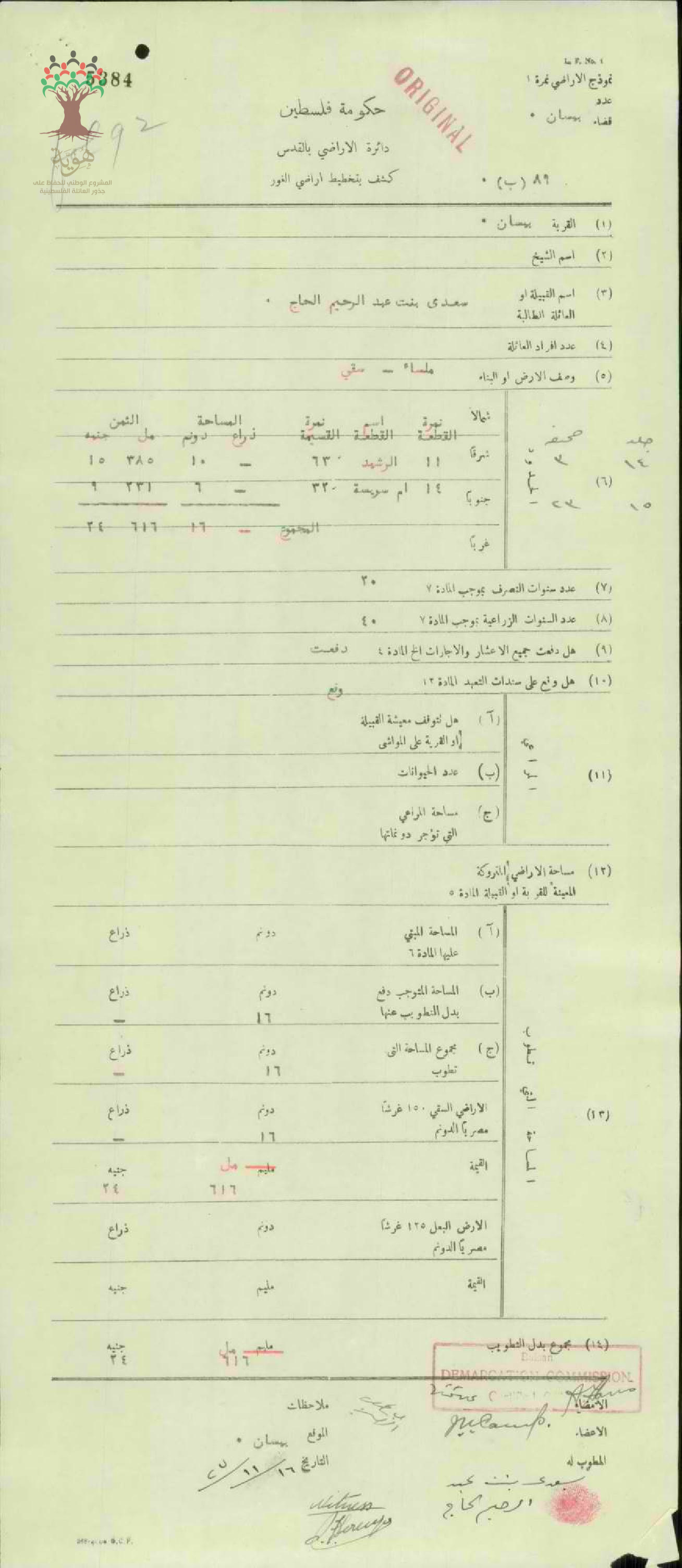 كشف تخطيط أرض سعدى بنت عبد الرحيم الحاج في بيسان