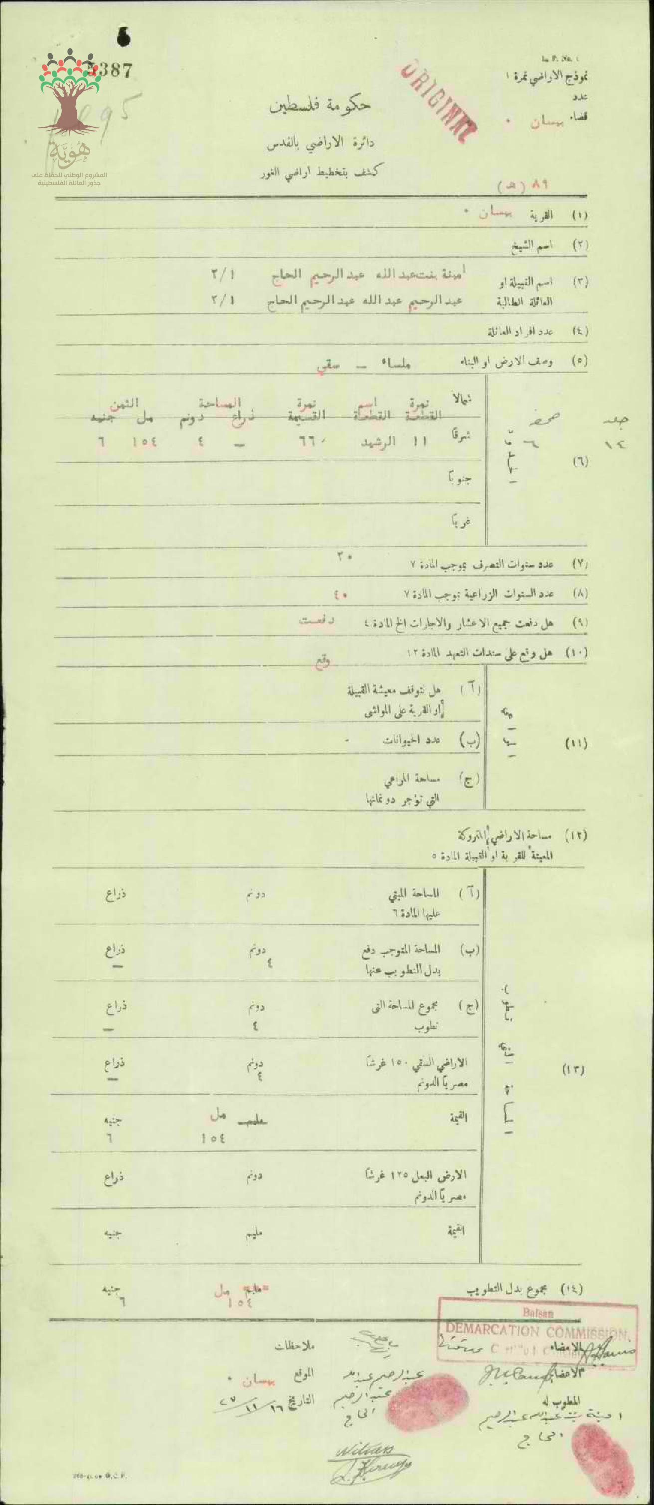 كشف تخطيط أرض أبناء عبد الله عبد الرحيم الحاج في بيسان