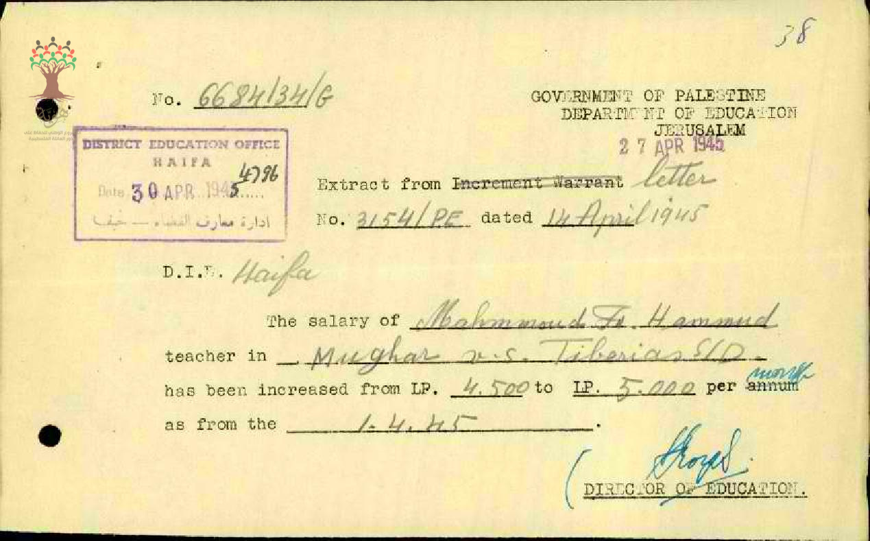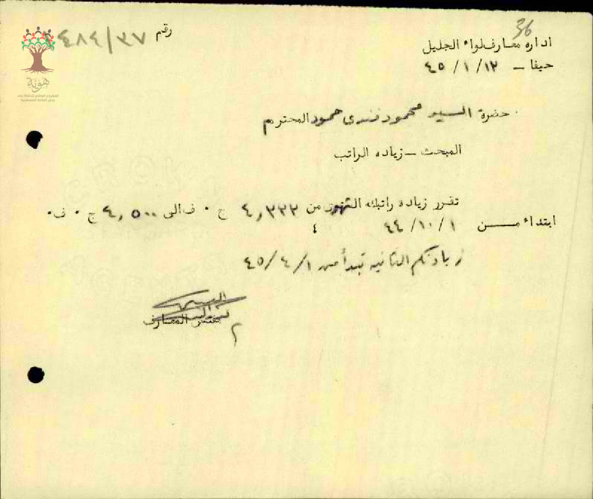 زيادة مرتب الاستاذ محمود فندي حمود - الخالصة - مدرسة المغار