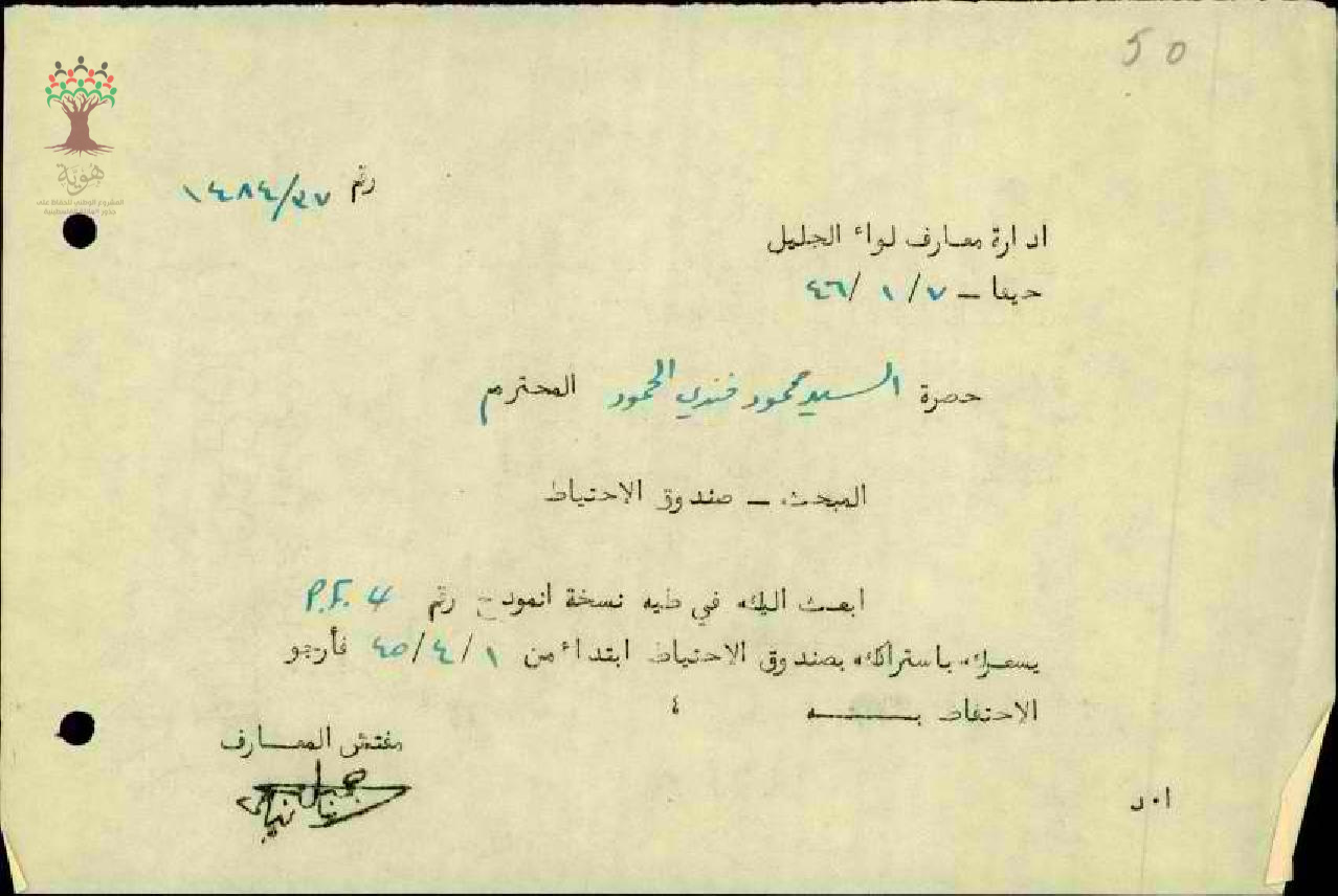 اشتراك الاستاذ محمود فندي حمود في صندوق الاحتياط - الخالصة - مدرسة المغار