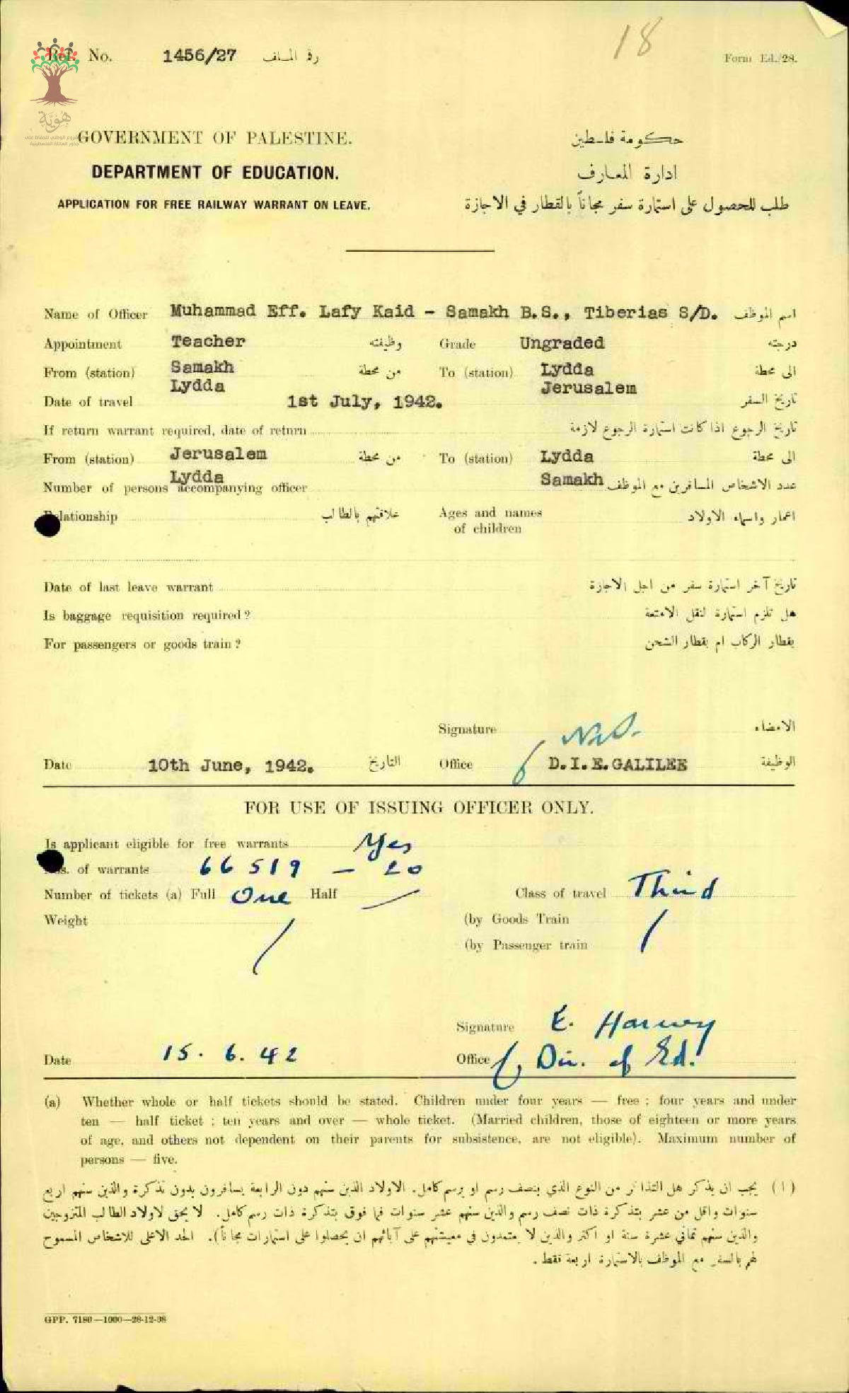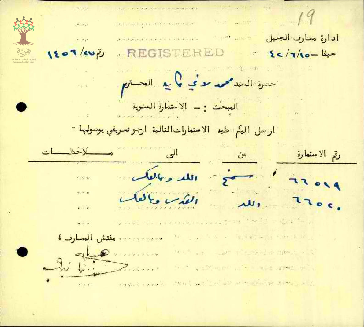 رسالة من مفتش المعارف الى المعلم محمد كايد مرفقة باستمارة سفره