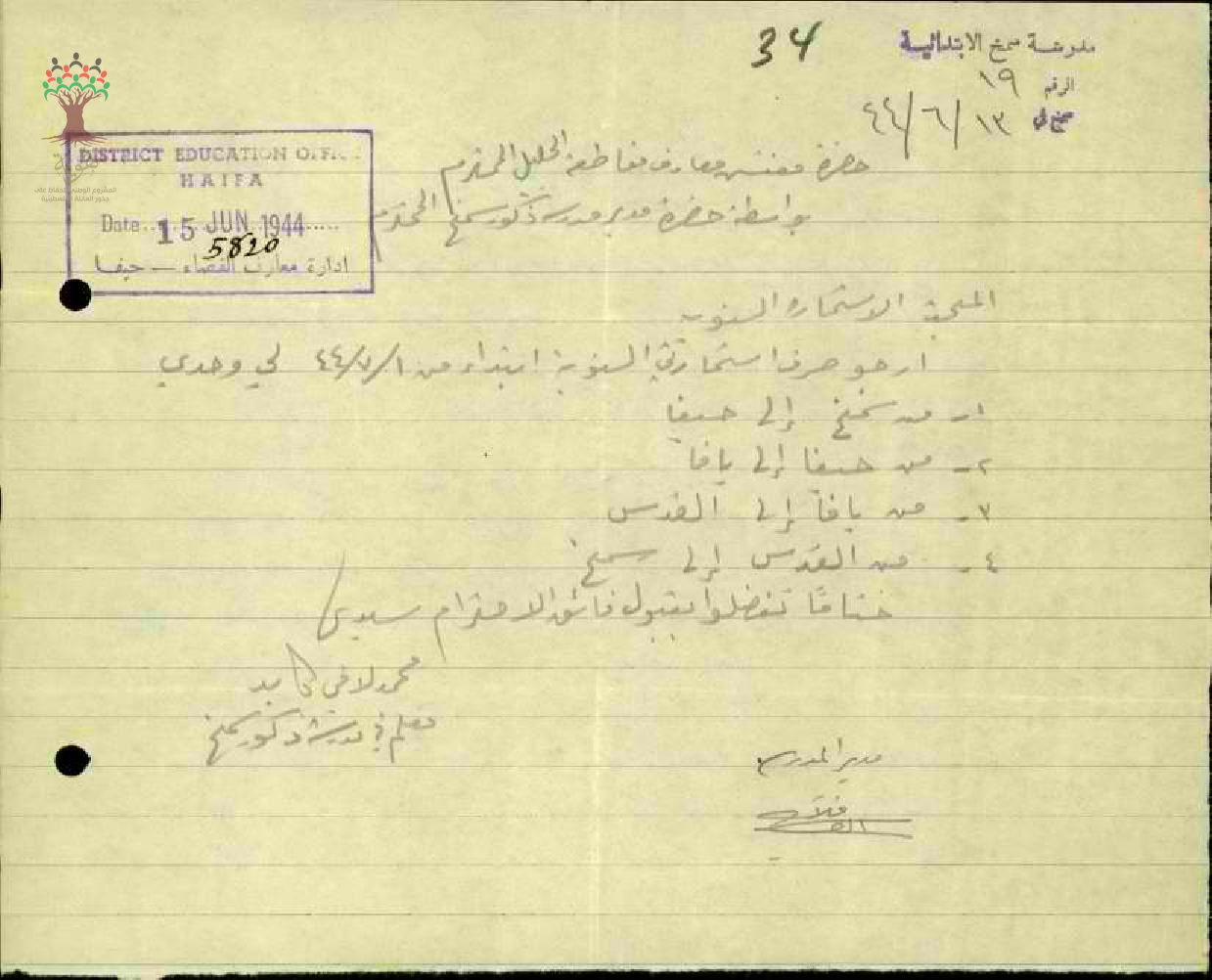 رسالة من المعلم محمد كايد الى مفتش المعارف يطلب فيها استمارة سفره السنوية