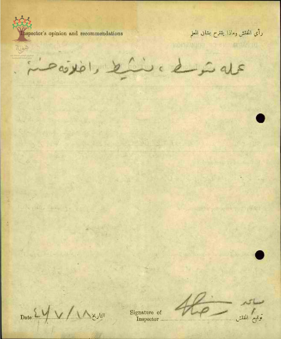 رأي المفتش العام بالمعلم محمود فندي حمود - الخالصة - مدرسة المغارة
