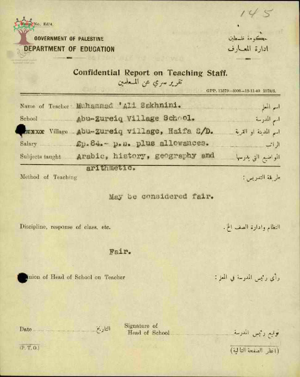 رأي مدير مدرسة ابو زريق بالمعلم محمد علي السخنيني - سخنين