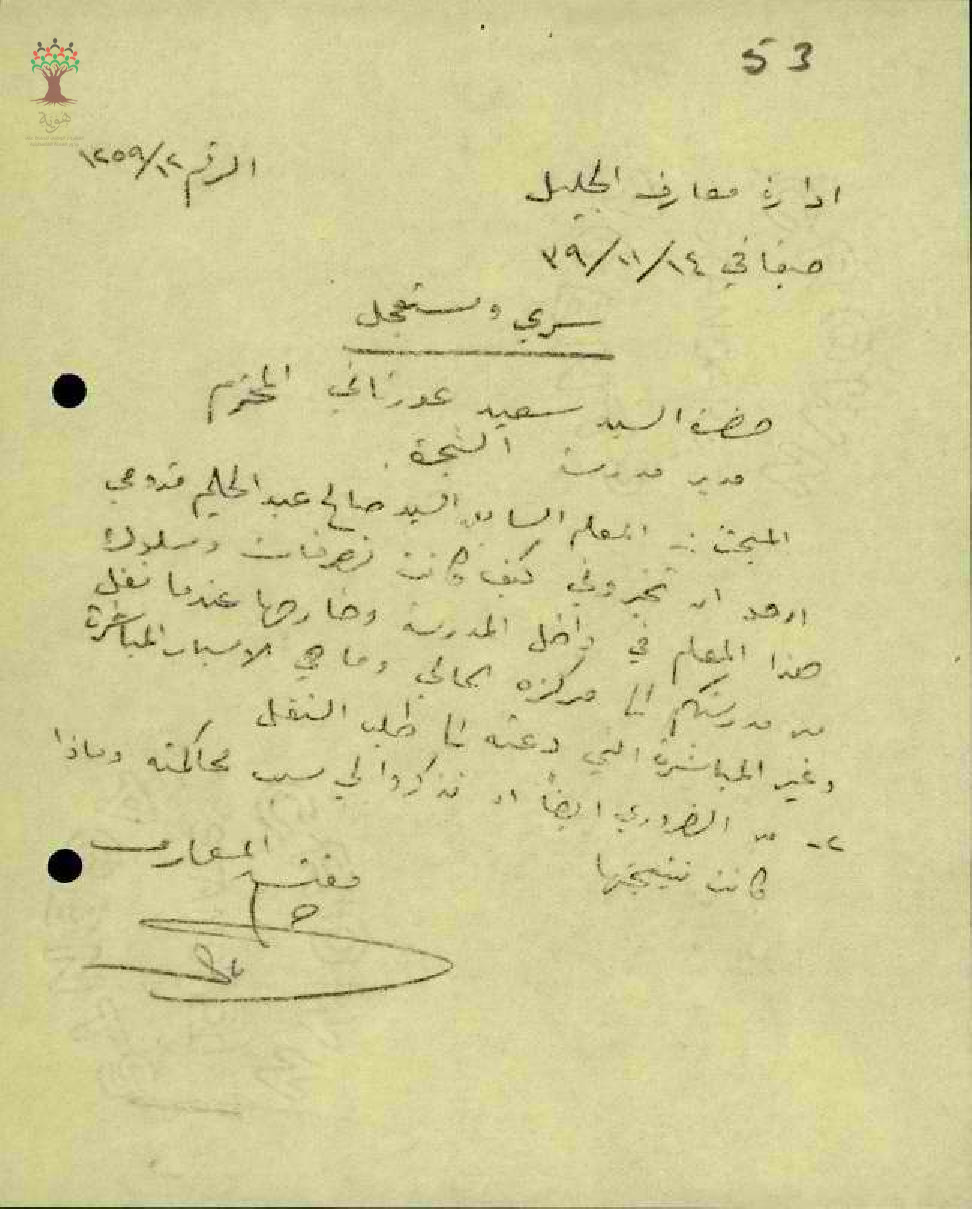 رسالة من مفتش دائرة المعارف الى مدير مدرسة الشجرة بخصوص المعلم صالح عبد القدومي - كفر قدوم