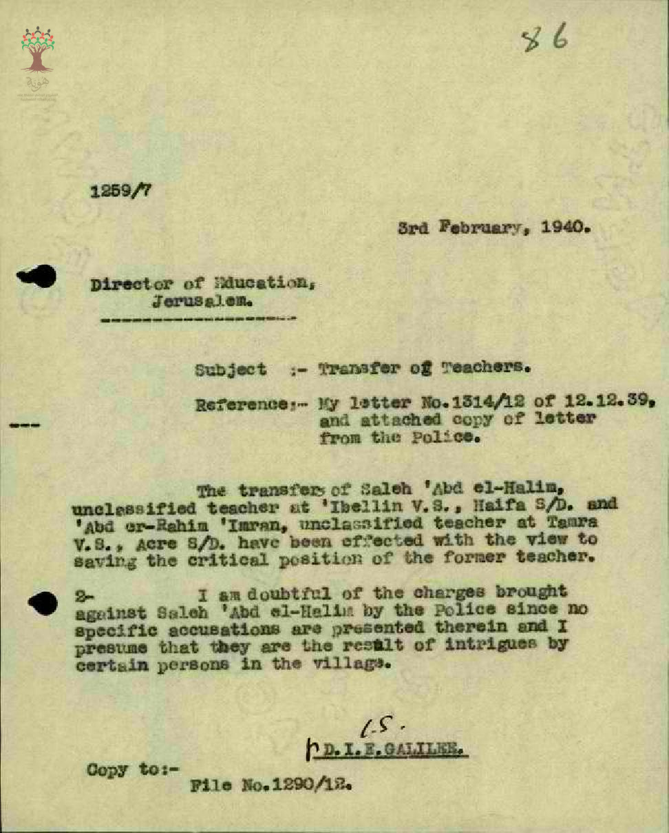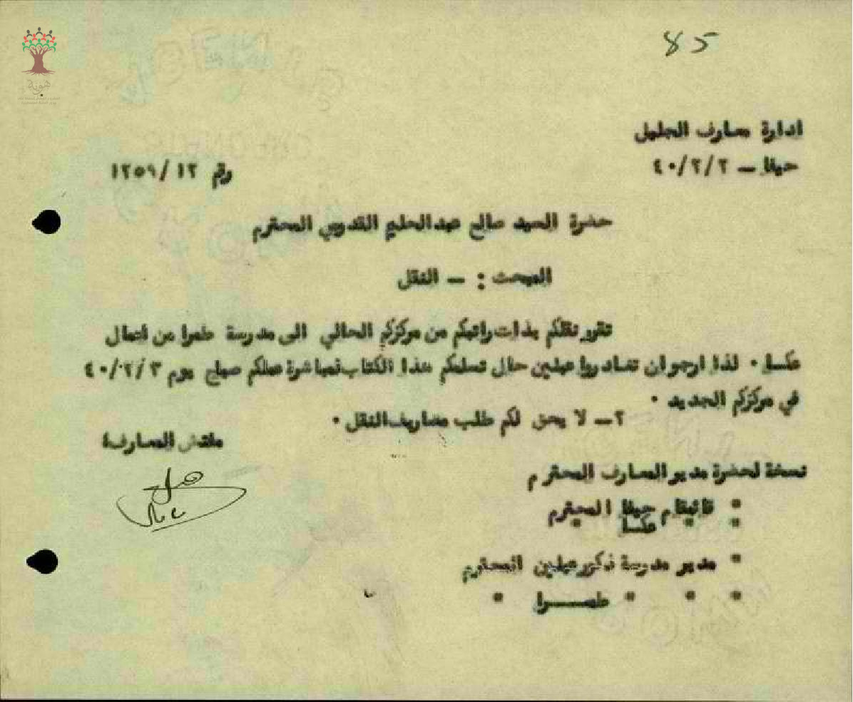 نقل المعلم صالح عبد الحليم من مدرسة عبلين الى مدرسة طمرة - كفر قدوم