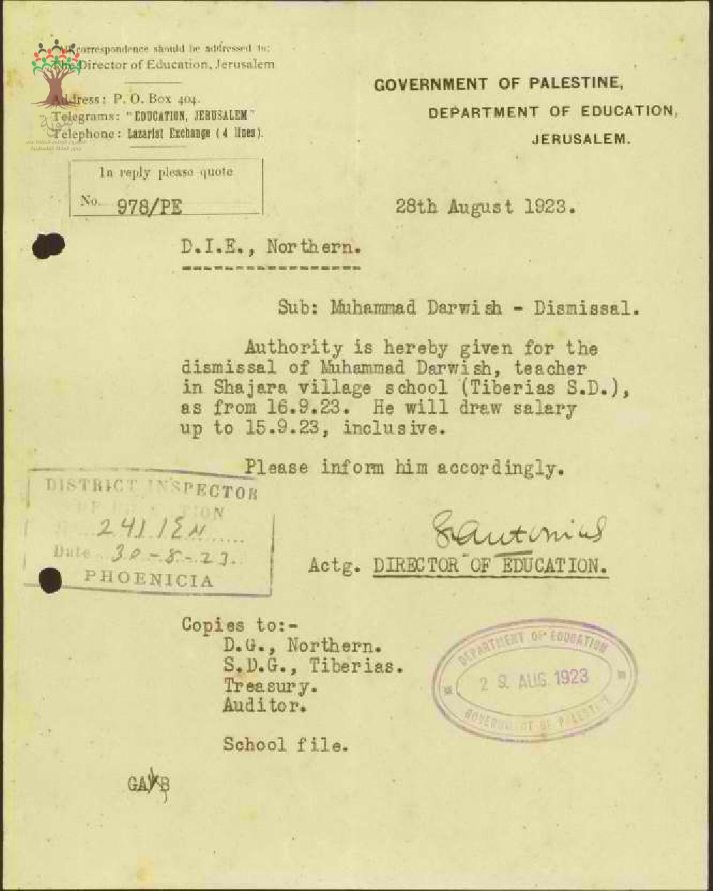 رسالة من مدير المعارف الى مفتش المعارف بخصوص فصل المعلم محمد درويش من الخدمة