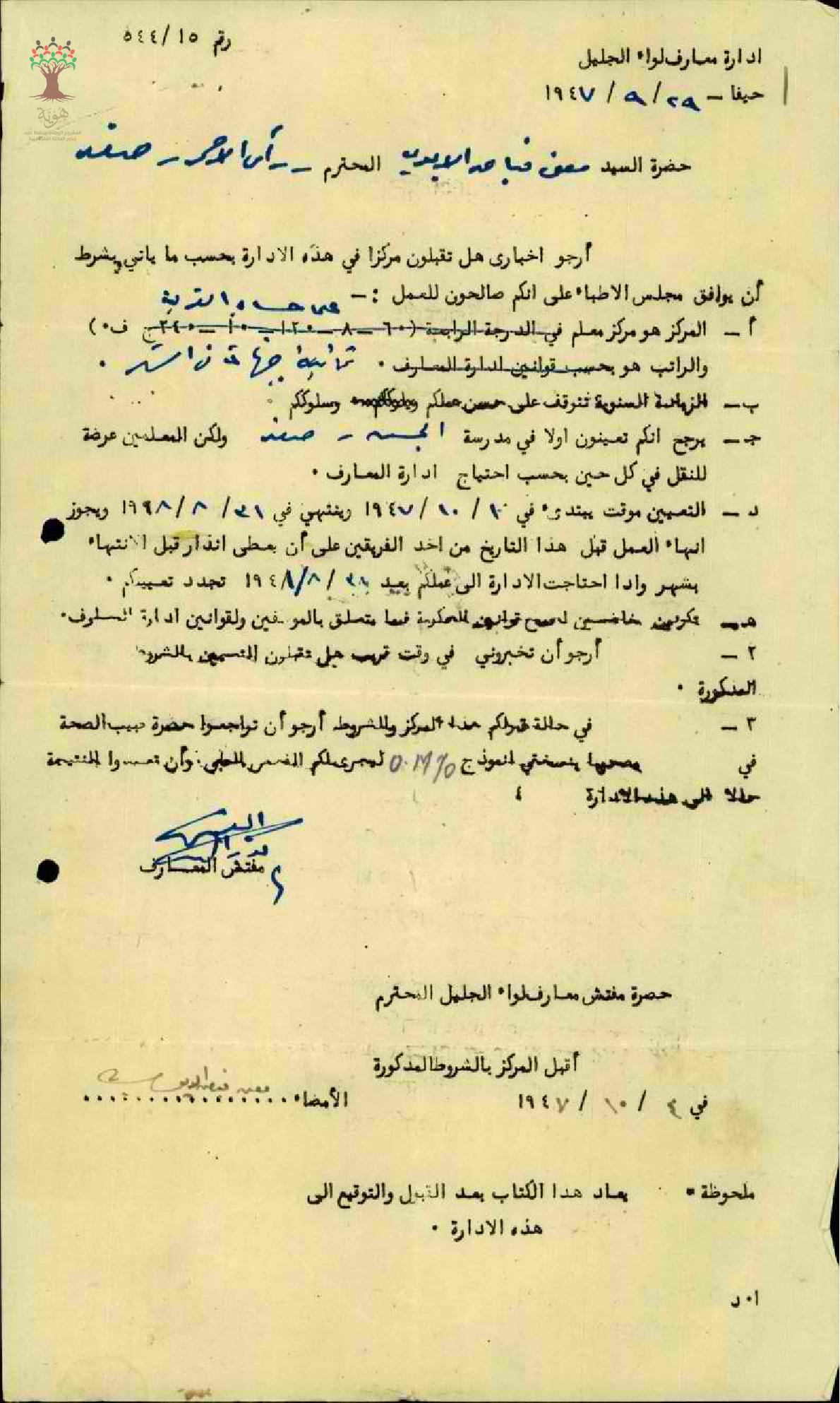 توقيع المعلم معن أيوب على شروط تعيينه في مدرسة الجش على حساب القرية