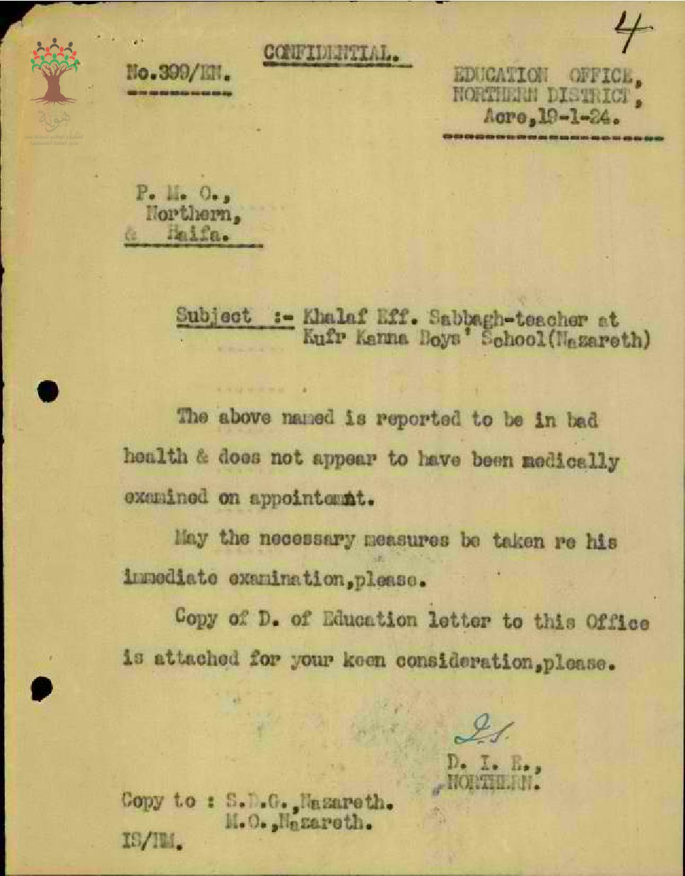 رسالة من مفتش المعارف الى رئيس الأطباء يسأل عن الحالة الصحية للمعلم خلف صباغ