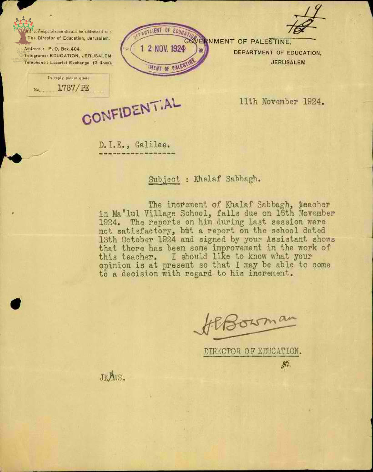 رسالة من مدير المعارف الى مفتش المعارف يسأل عن أداء المعلم خلف صباغ لاعطائه زيادته السنوية