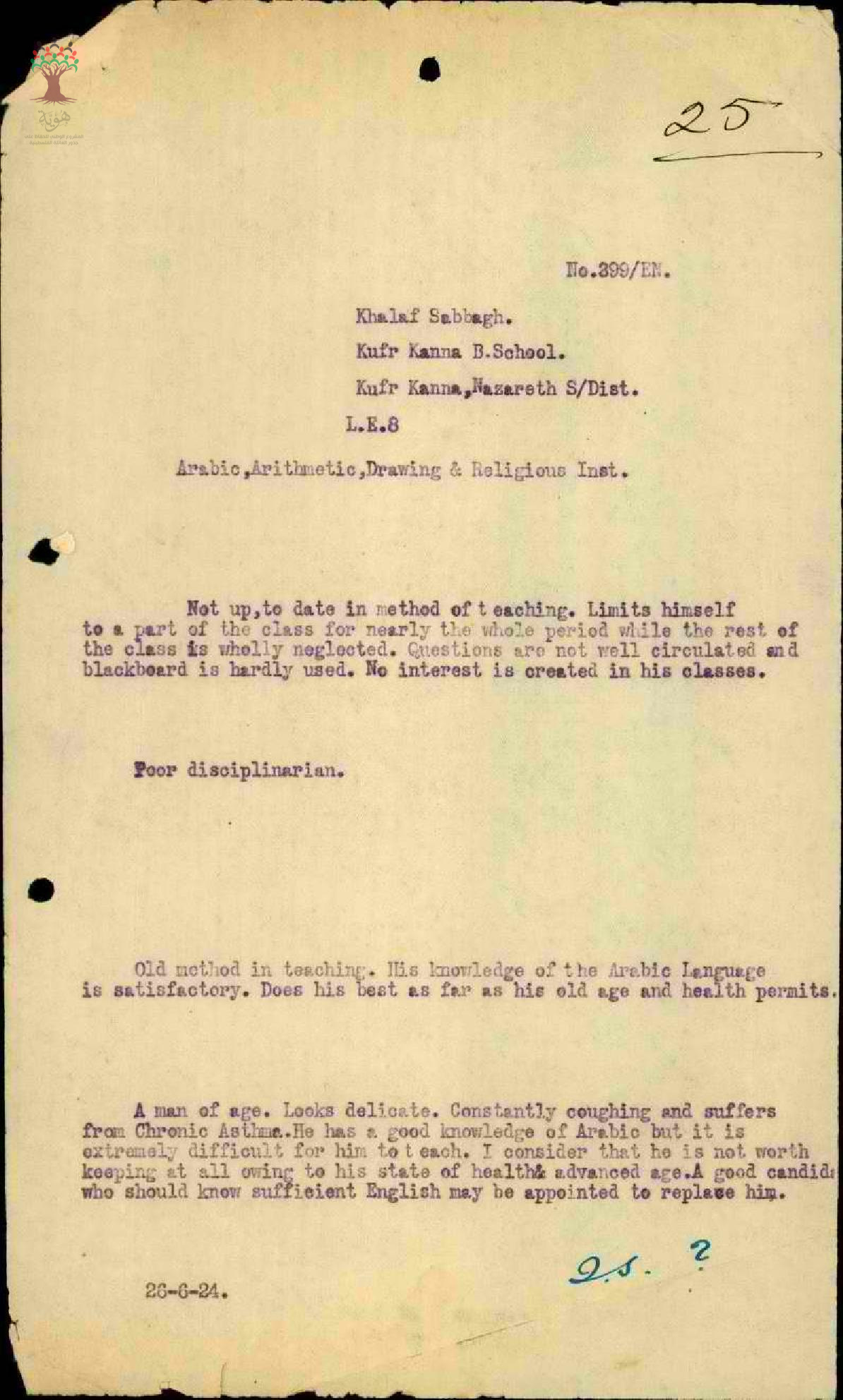 تقرير عن أداء المعلم خلف صباغ في مدرسة معلول سنة 1924