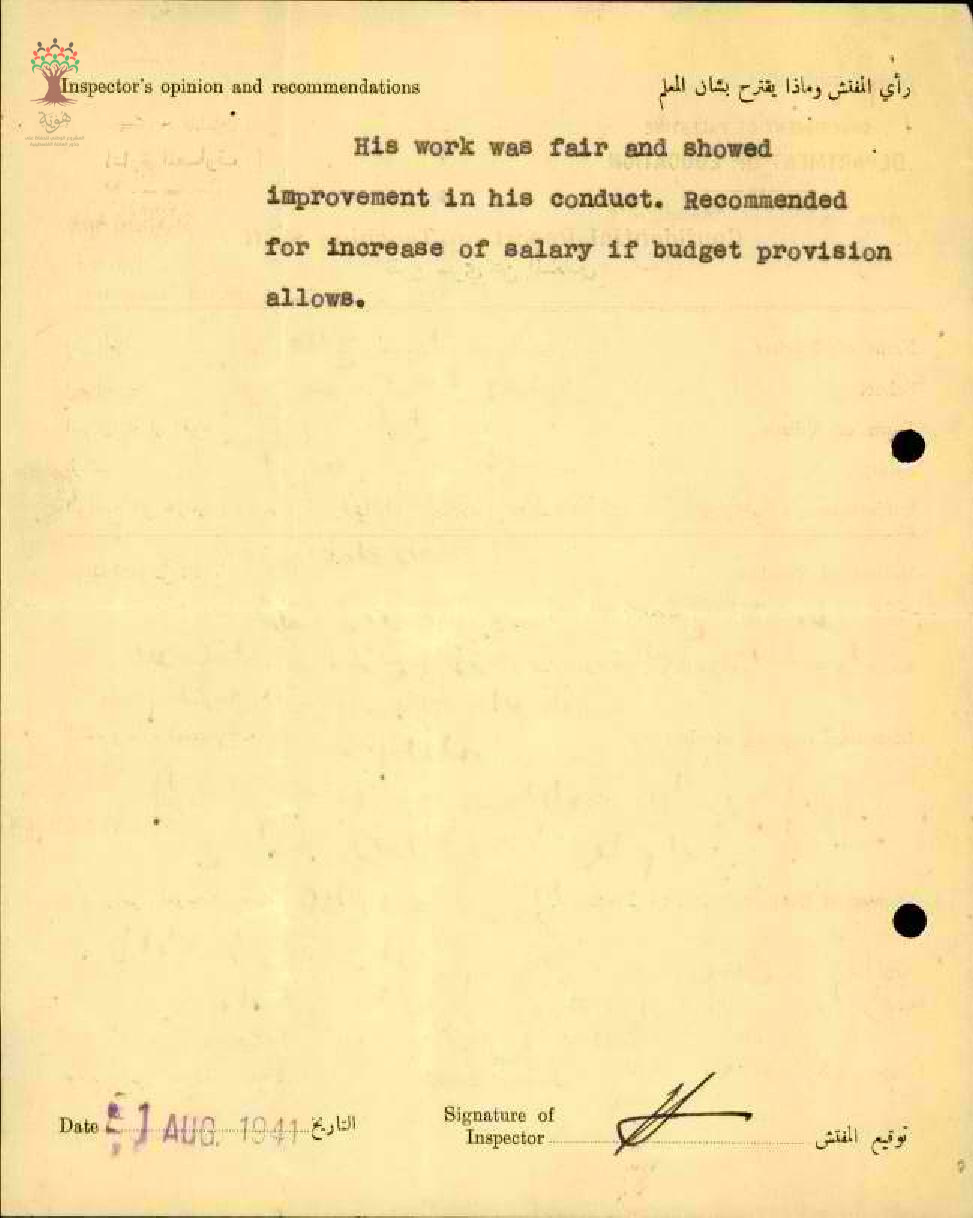 رأي المفتش العام بالمعلِم صالح عبد الحليم القدومي - كفر قدوم - مدرسة طمرة