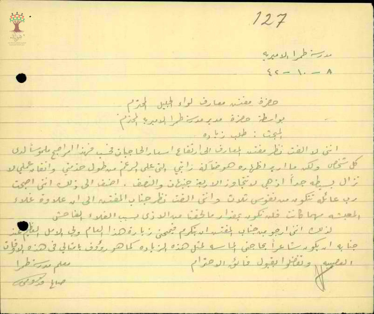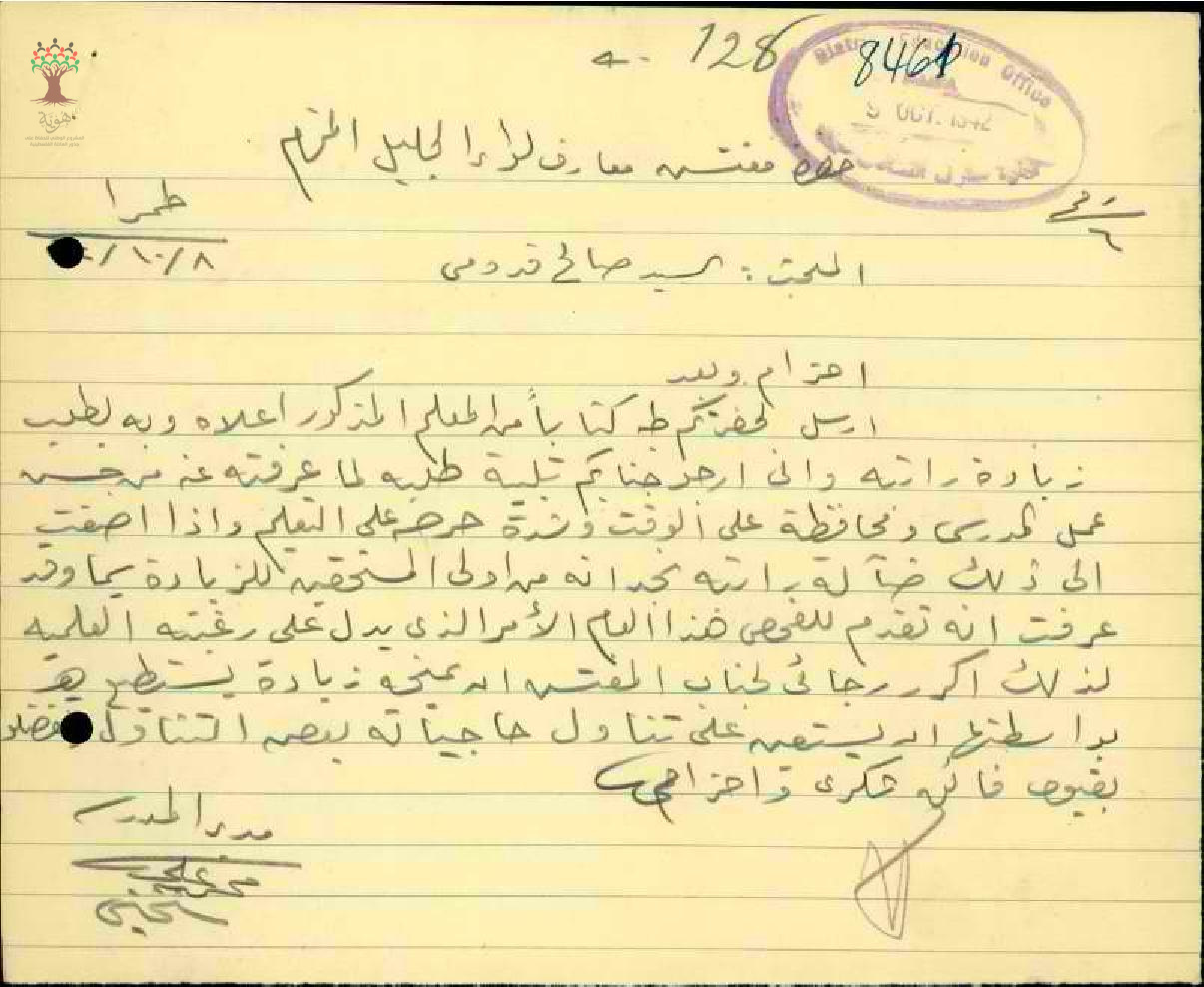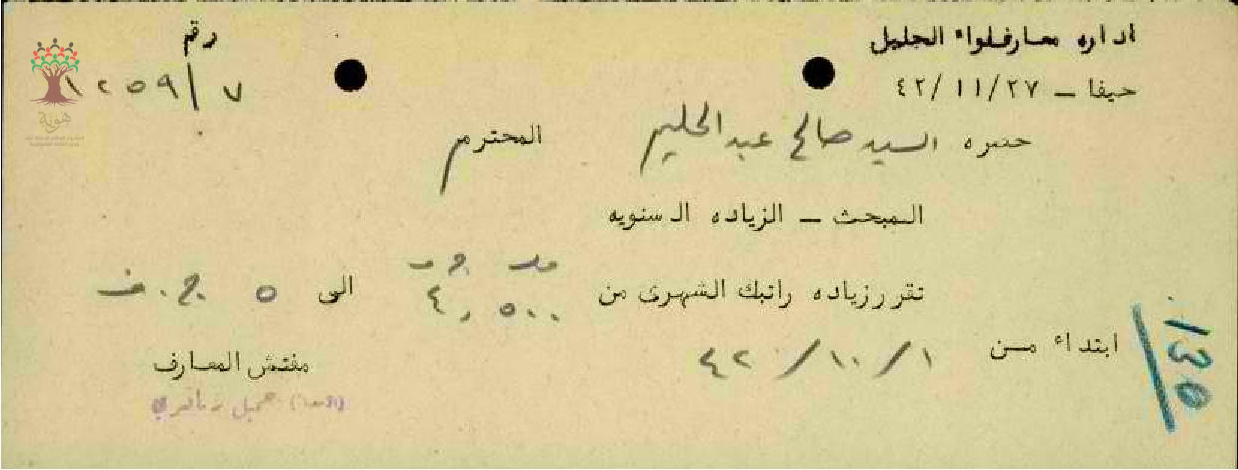 طلب زيادة مرتب مقدم من قبل المعلم صالح عبد الحليم القدومي و الموافقة عليه - كفر قدوم - مدرسة طمرة