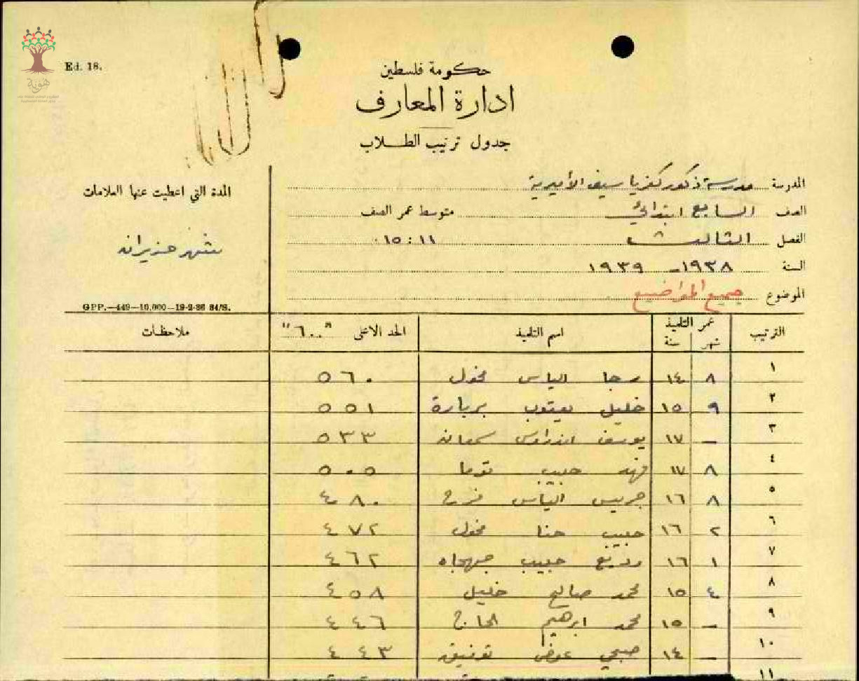 علامات جميع المواضيع لطلاب مدرسة كفر ياسيف سنة 1938 - الصف السابع
