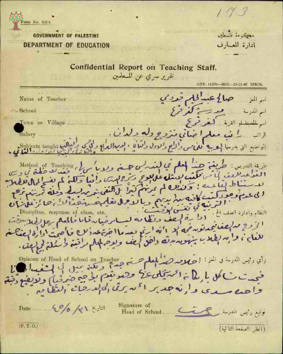 رأي مدير مدرسة كفر فرع بالمعلم صالح القدومي - كفر قدوم