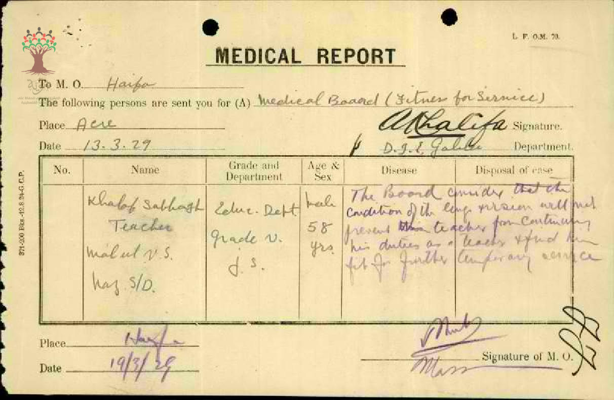 تقرير طبي بنتيجة المعاينة الصحية للمعلم خلف صباغ