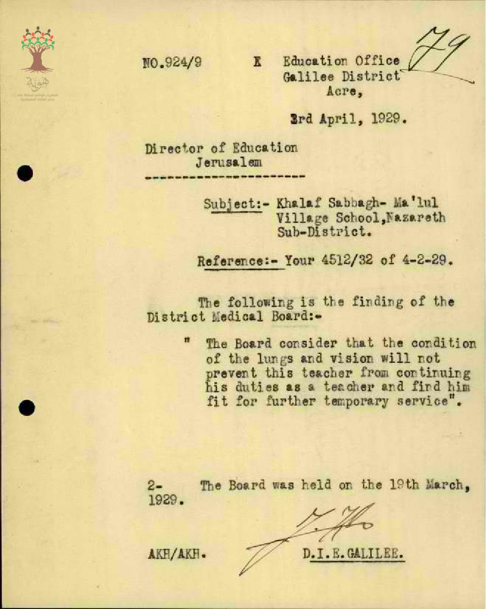 رسالة من مفتش المعارف الى مدير المعارف بخصوص نتيجة الفحص الطبي للمعلم خلف صباغ وأنه يمكنه مزاةلة عمله بشكل طبيعي