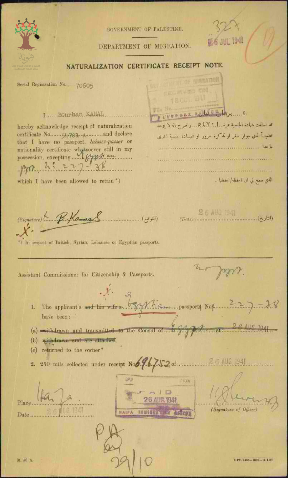 ايصال موقع من برهان كمال باستلام شهادة الجنسية الفلسطينية