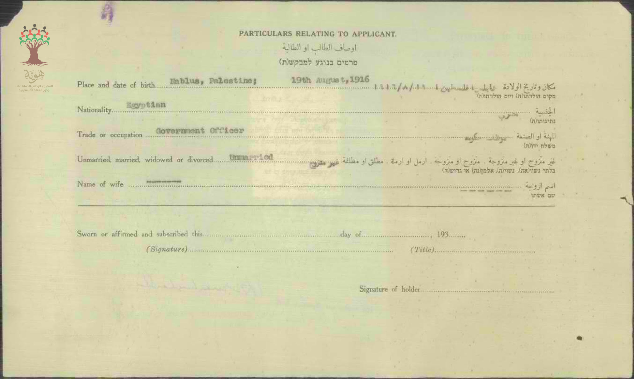 شهادة الجنسية الفلسطينية لبرهان كمال