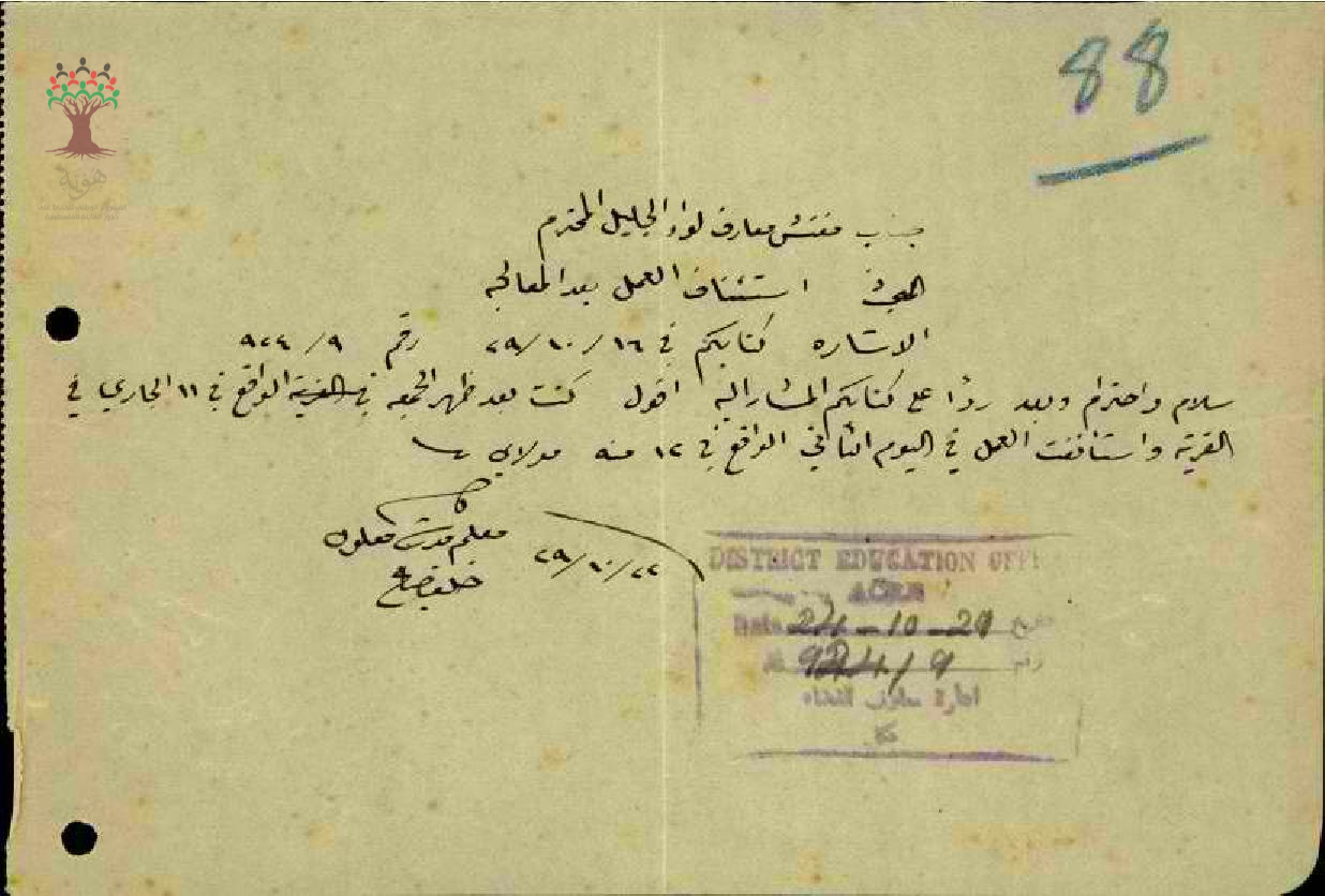 رسالة من المعلم خلف صباغ الى مفتش المعارف يخبره بأنه قد عاد الى العمل