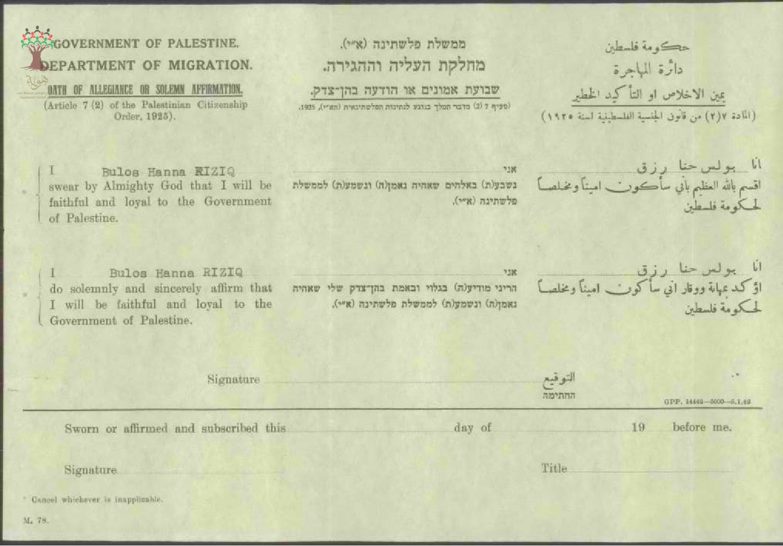 بولس رزق يوقع على يمين الإخلاص للحصول على الجنسية الفلسطينية