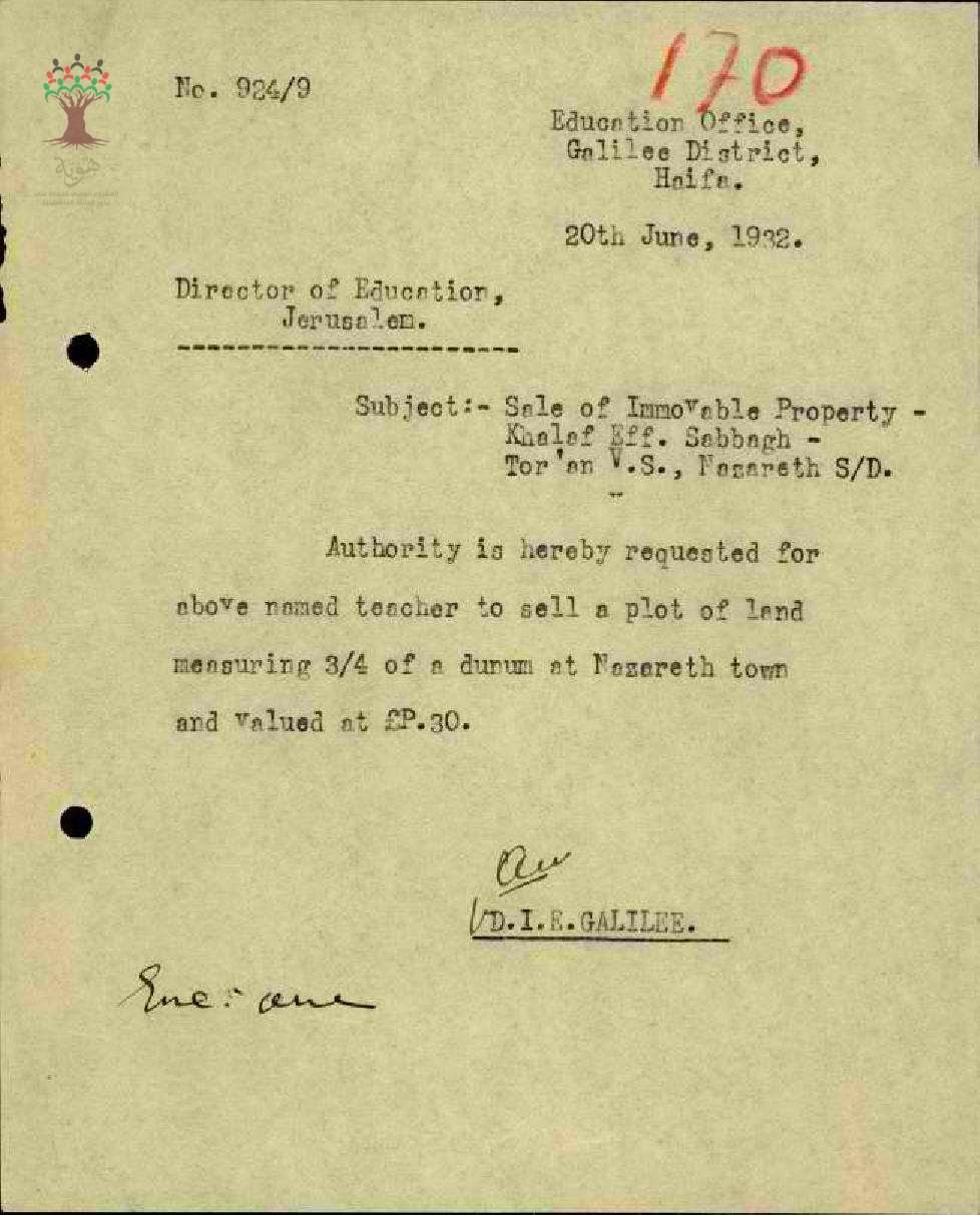 رسالة من مفتش المعارف الى مدير المعارف ينقل اليه طلب المعلم خلف صباغ ببيع قطعة أرض