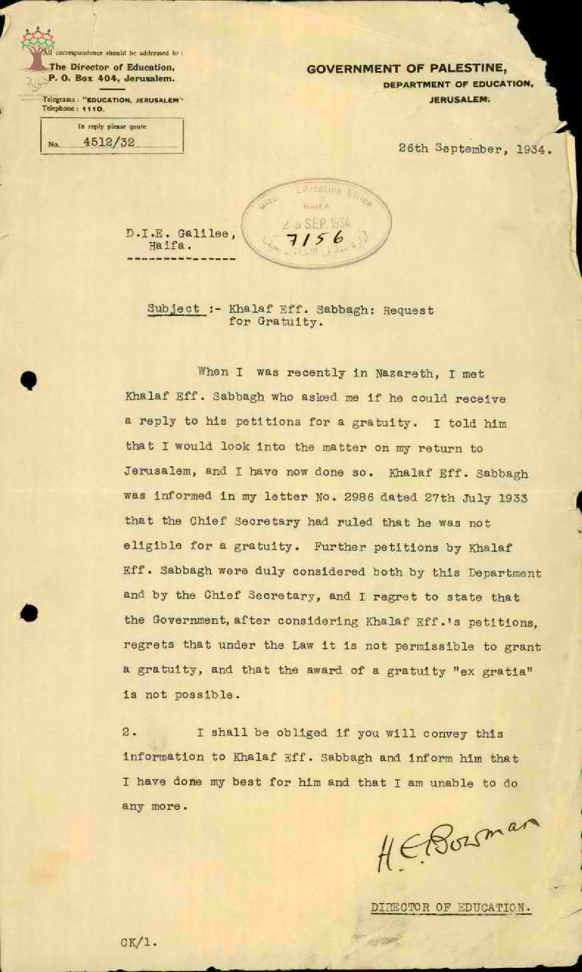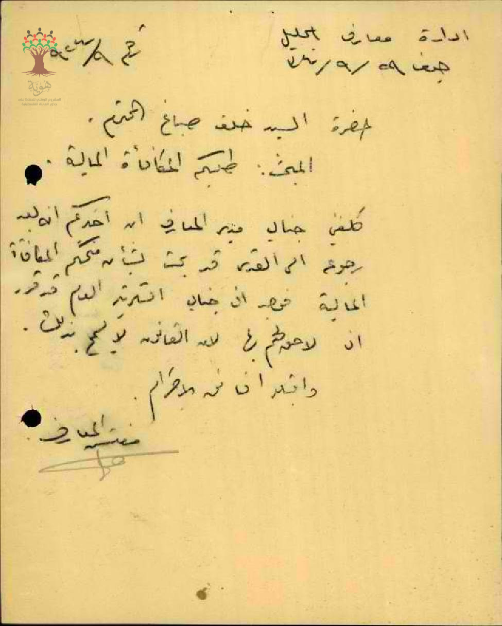 رسائل من ادارة المعارف الى المعلم خلف صباغ لأخباره بانه لا يحق له بمكافأة التقاعد لأن القانون لا يسمح بذلك