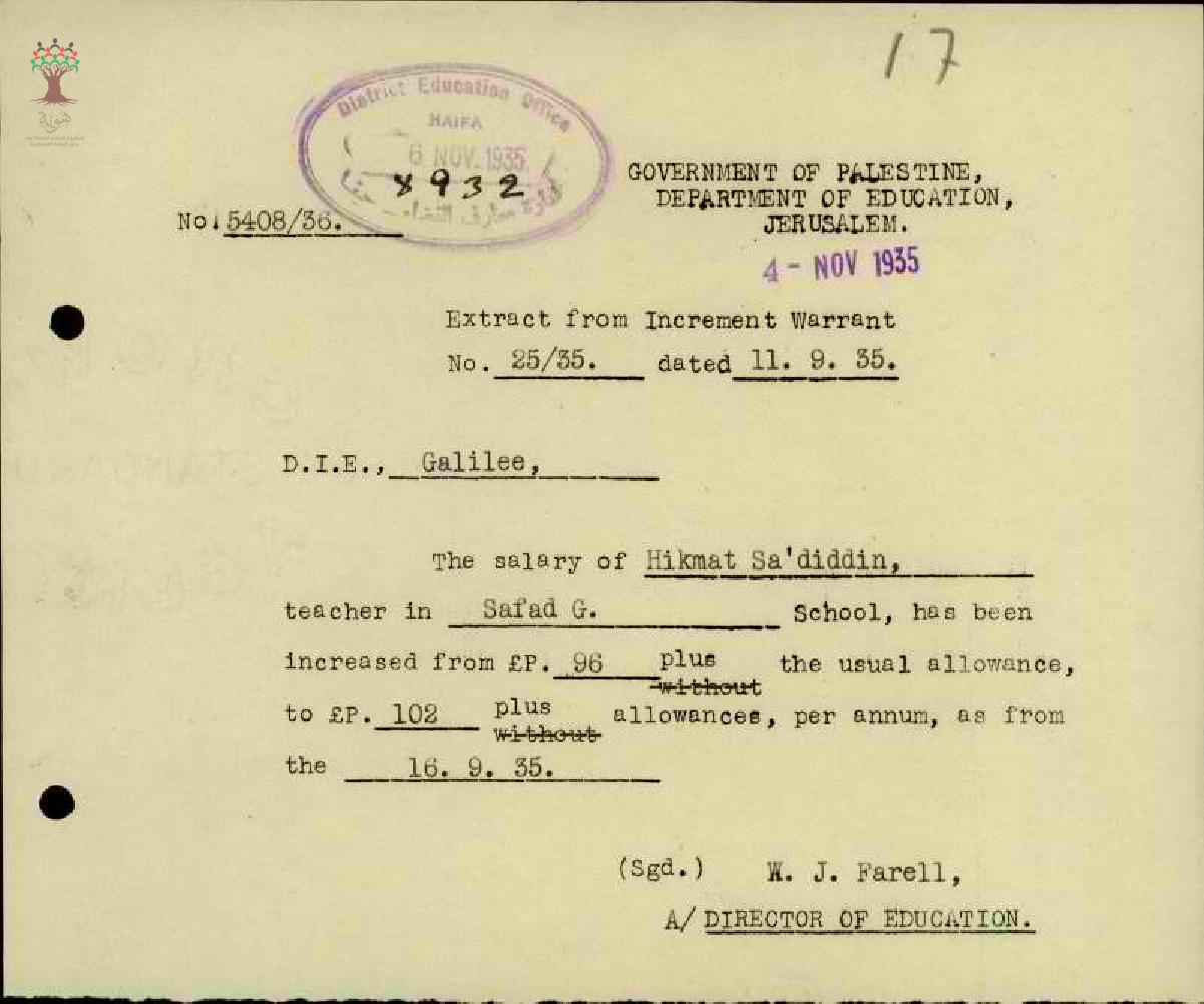 زيادر مرتب المعلمة حكمت سعد الدين - صفد - مدرسة صفد