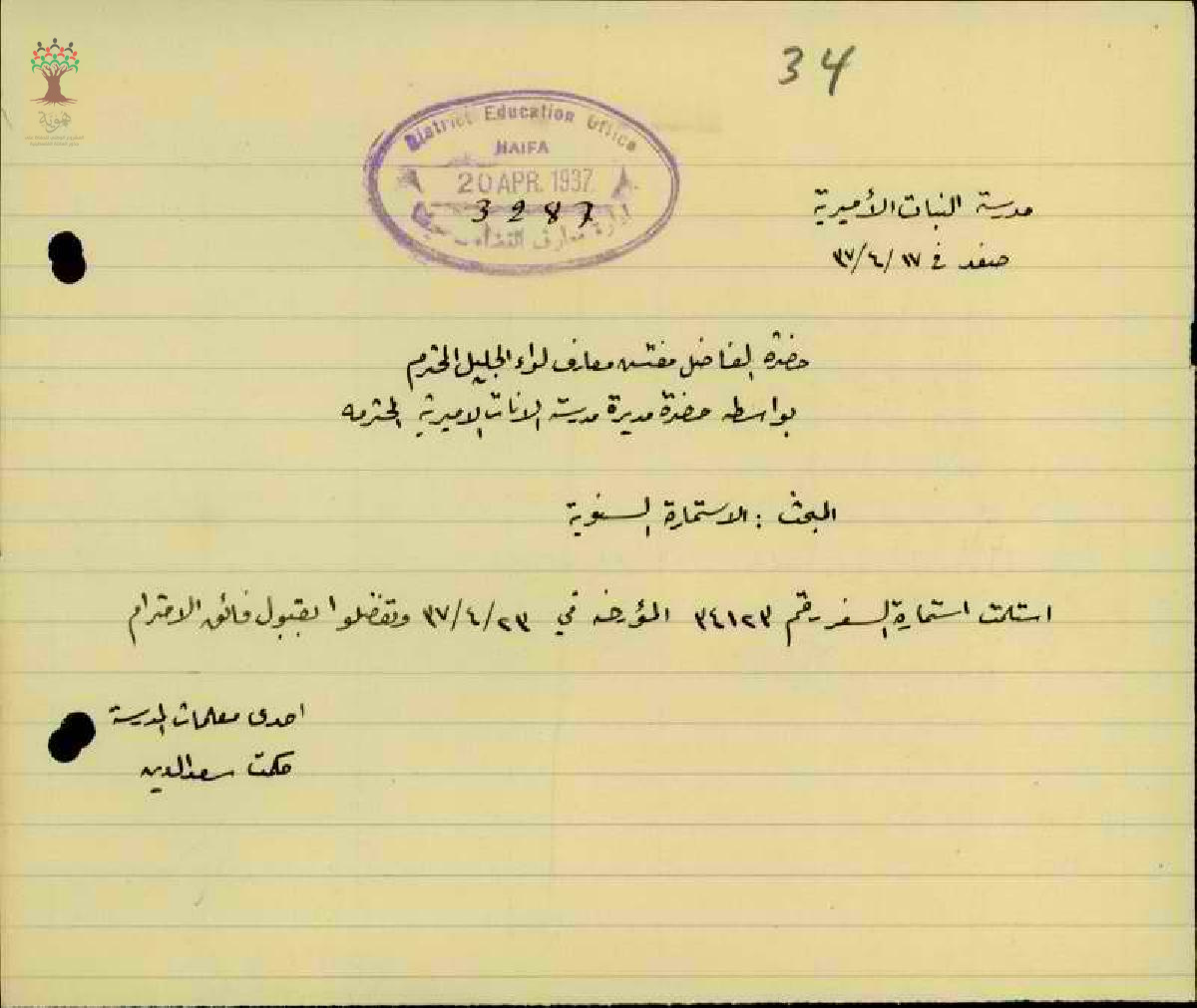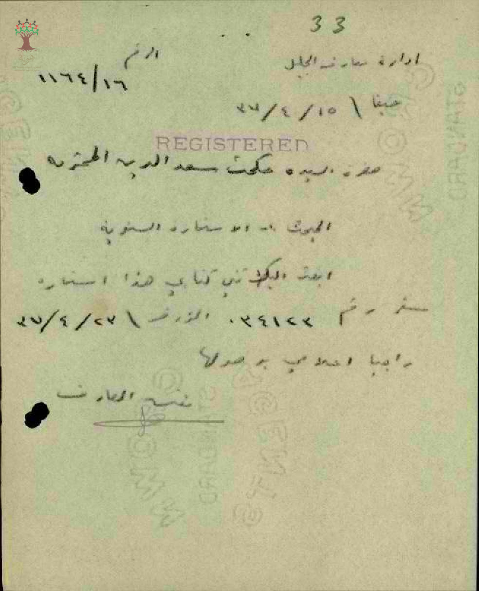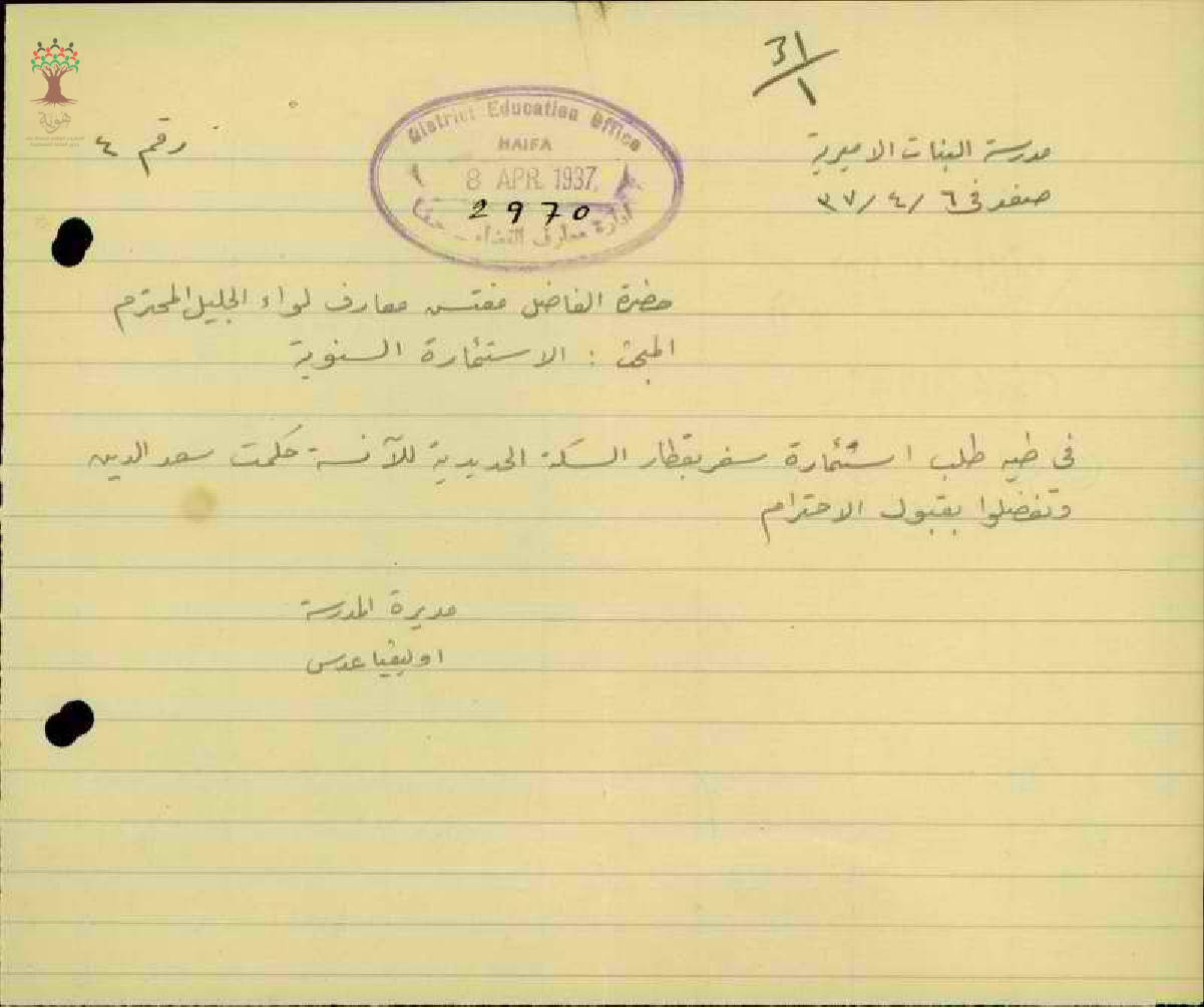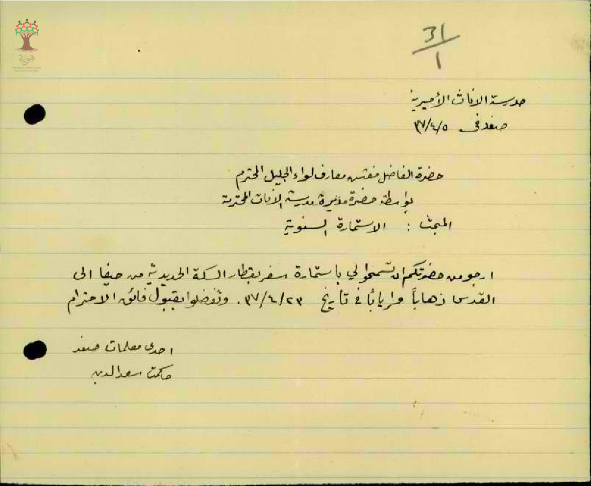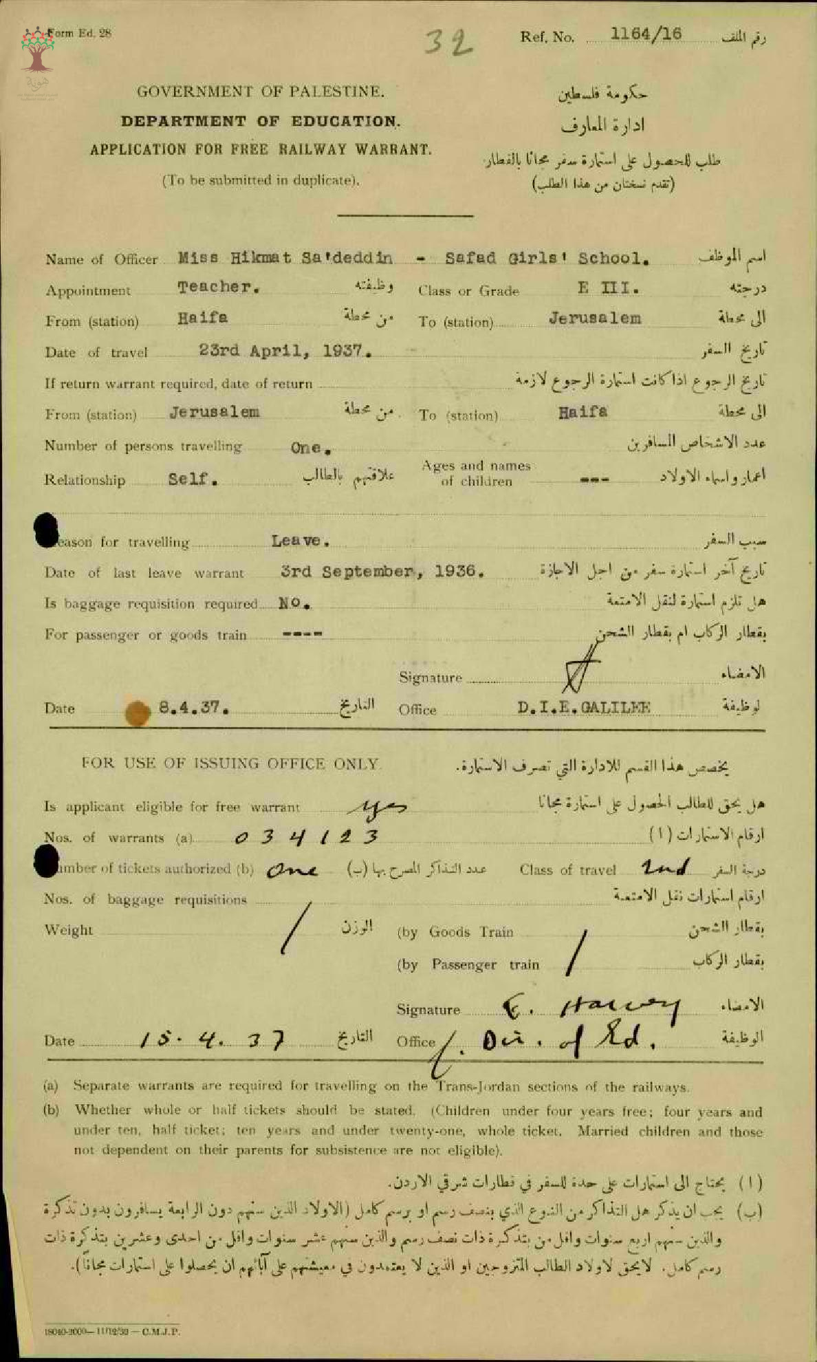 استمارة سفر من حيفا الى القدس مقدمة من قبل المعلمة حكمت سعد الدين - صفد - مدرسة صفد