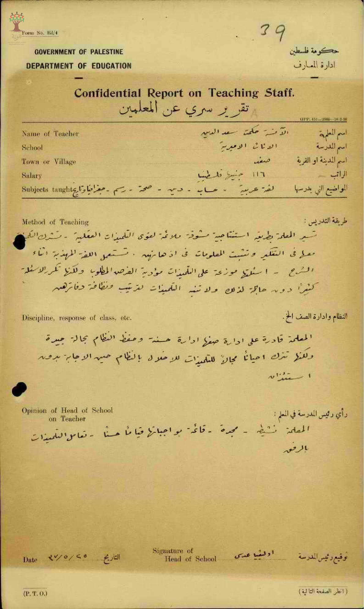 رأي مدير مدرسة صفد بالمعلمة حكمت سعد الدين - صفد - مدرسة صفد