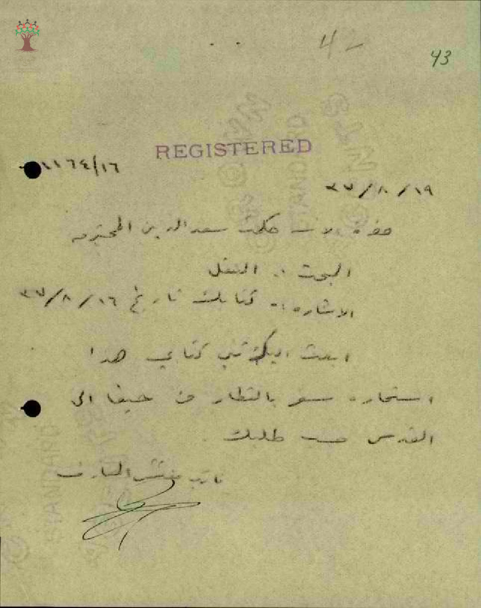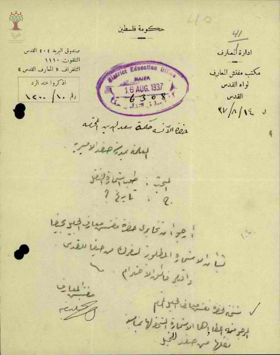 استمارة سفر من حيفا الى القدس المعلمة حكمت سعد الدين - صفد - مدرسة صفد