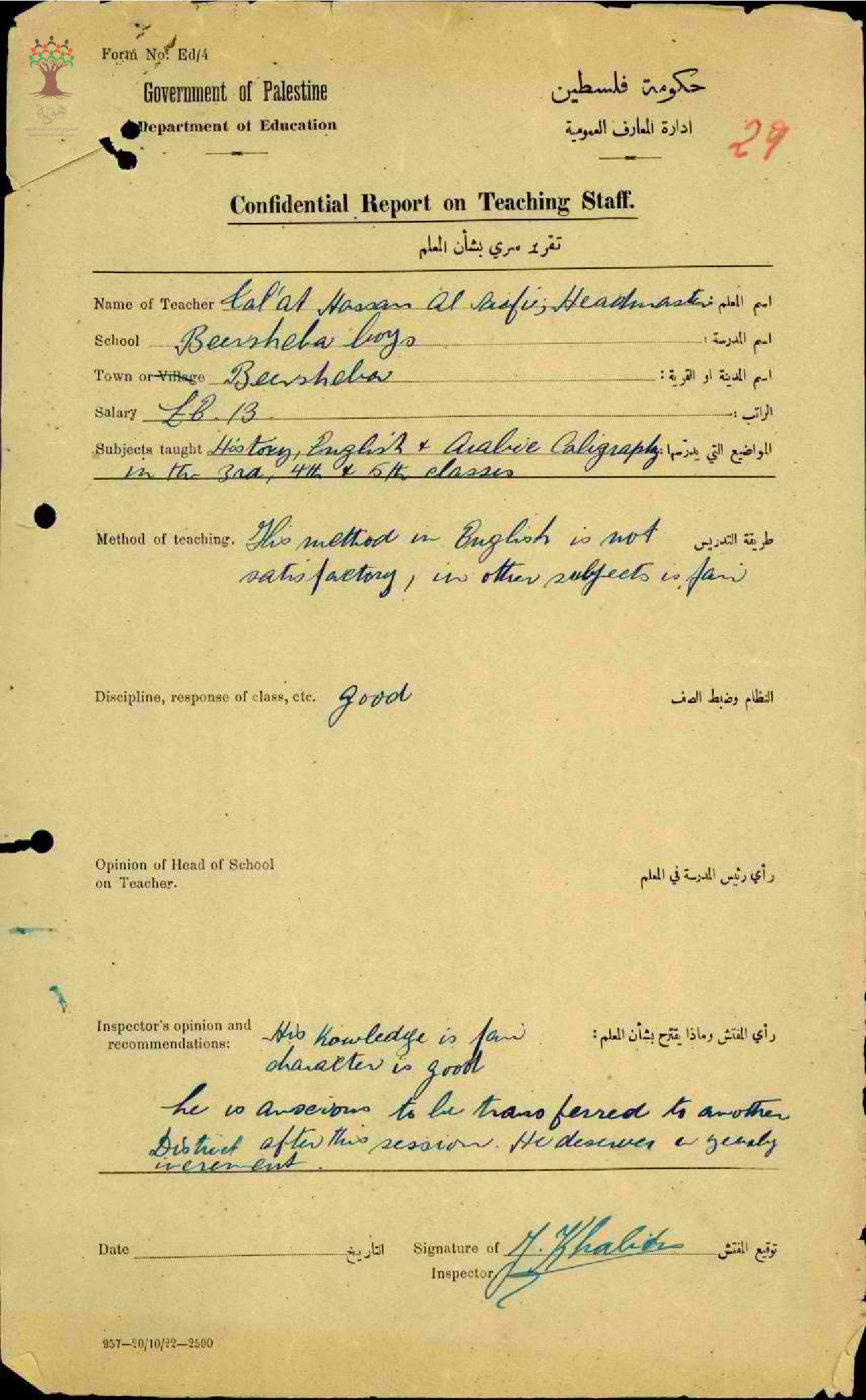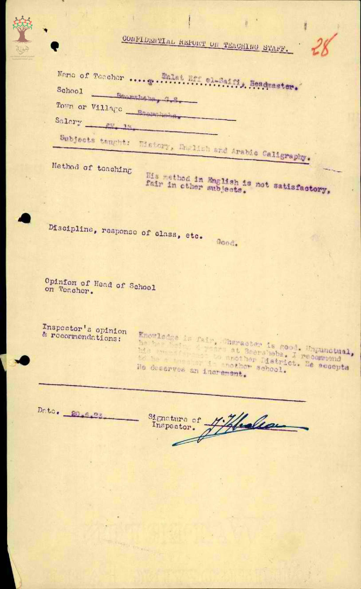 تقرير تفصيلي عن أداء المعلم طلعت السيفي في مدرسة بئر السبع سنة 1923