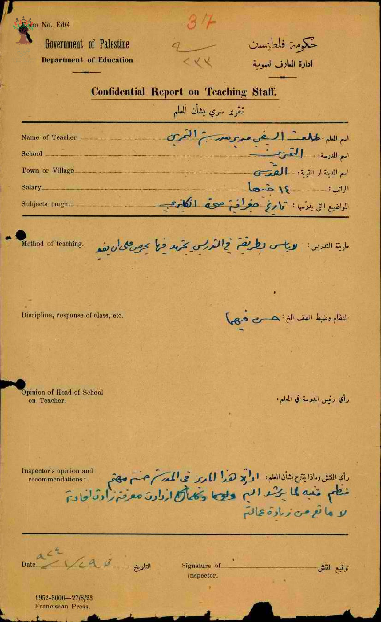 تقرير تفصيلي عن أداء المعلم طلعت السيفي في مدرسة التمرين/القدس سنة 1923