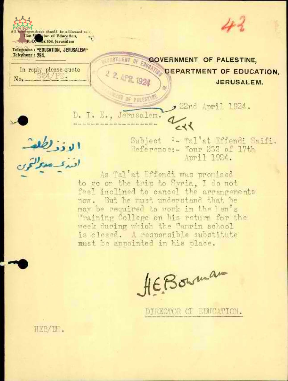 رسالة من مدير المعارف الى مفتش المعارف يسمح فيها للمعلم طلعت السيفي الى سوريا بشرط تأمين وكيل عنه