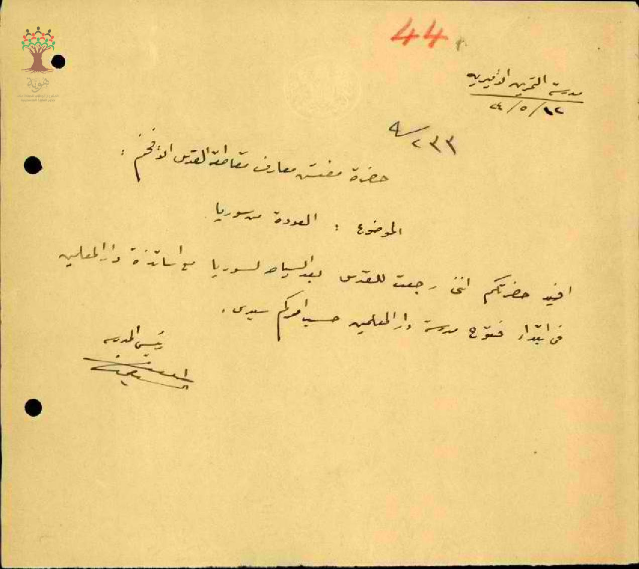 رسالة من المعلم طلعت السيفي الى مفتش المعارف يخبره بعودته من سوريا